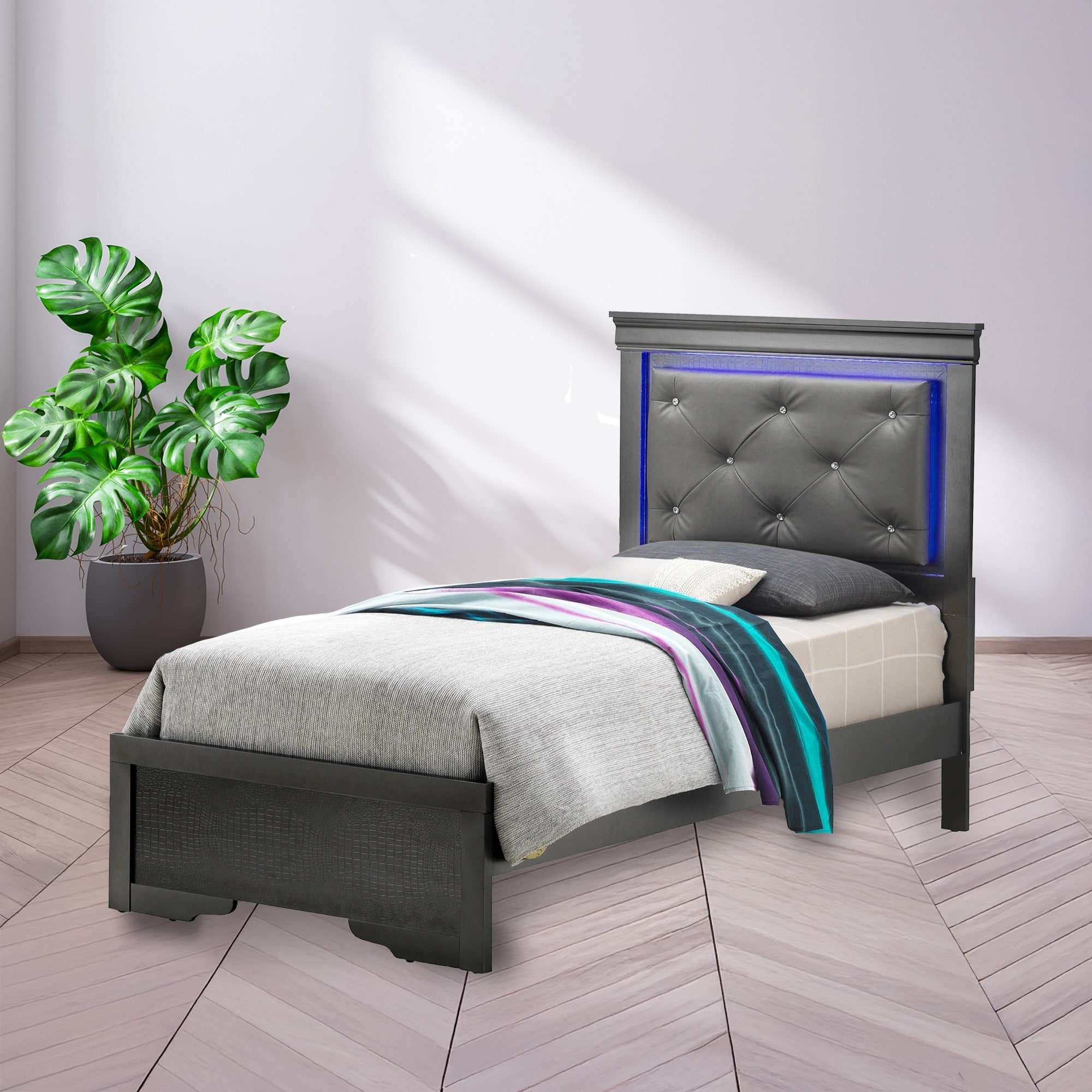 Jewel Tufted Upholstered Twin Panel Bed with LED Lights - 80" - Black