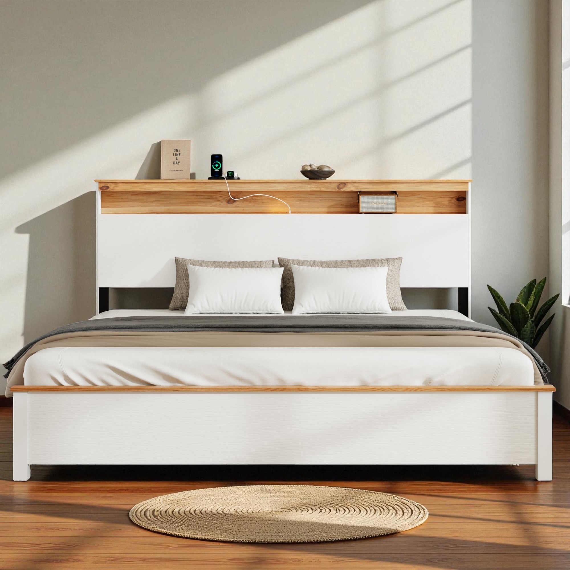 King Size Platform Bed Frame with LED Light, Charging Station and Storage Headboard, Wood Frame with Metal Slats