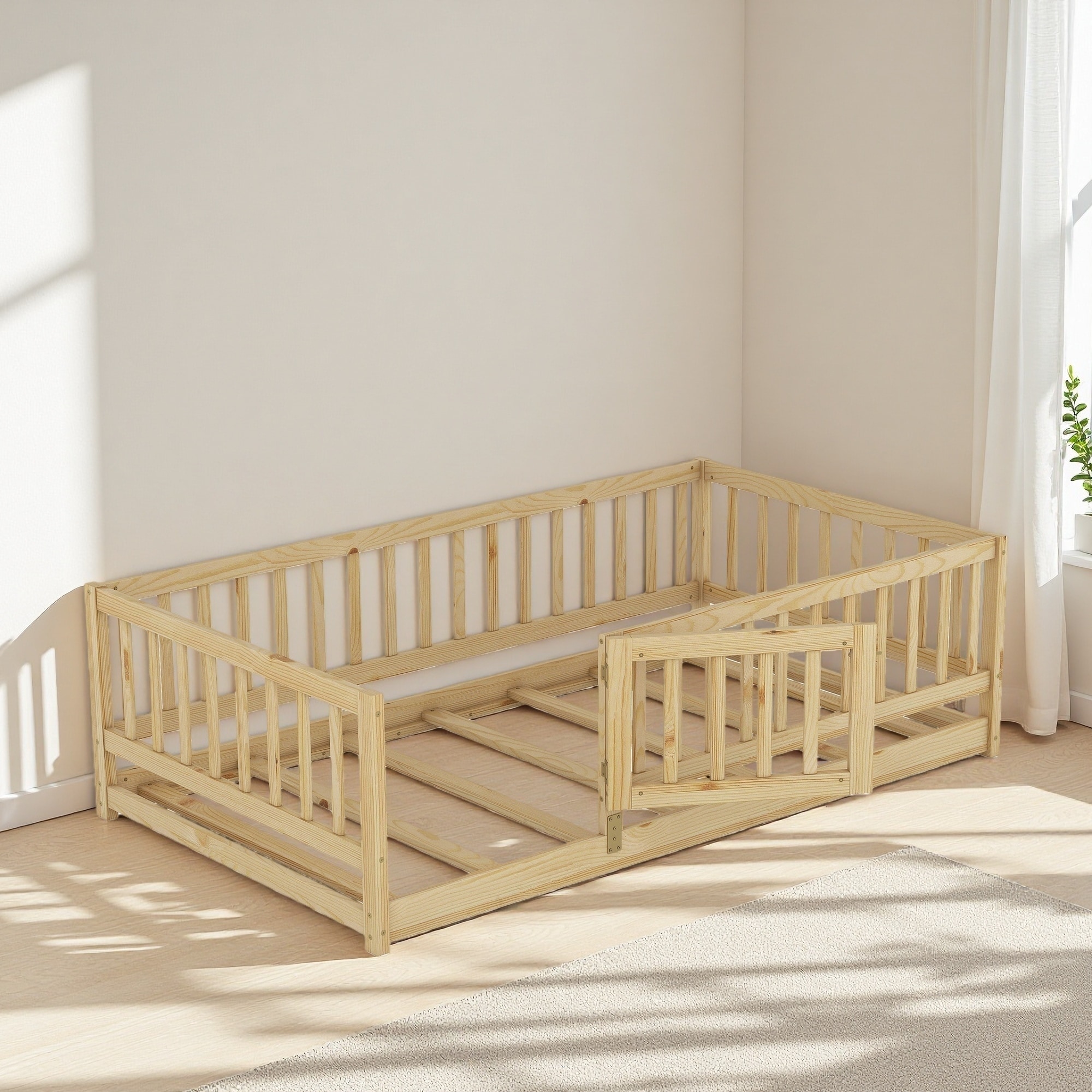Twin Size Solid Wood House-Shaped Floor Bed with Fence and Guardrails