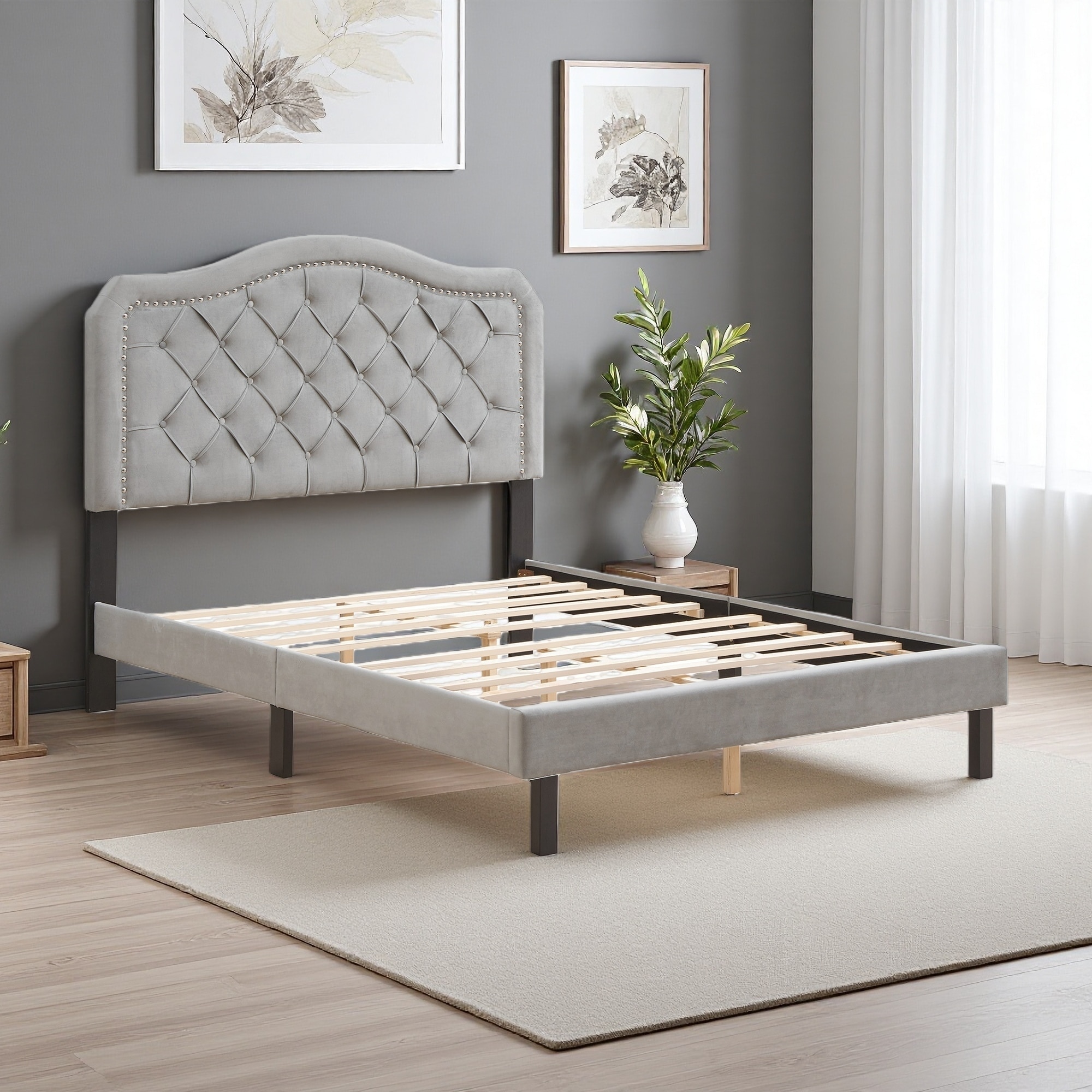 Queen Velvet Upholstered Platform Bed Curved Headboard