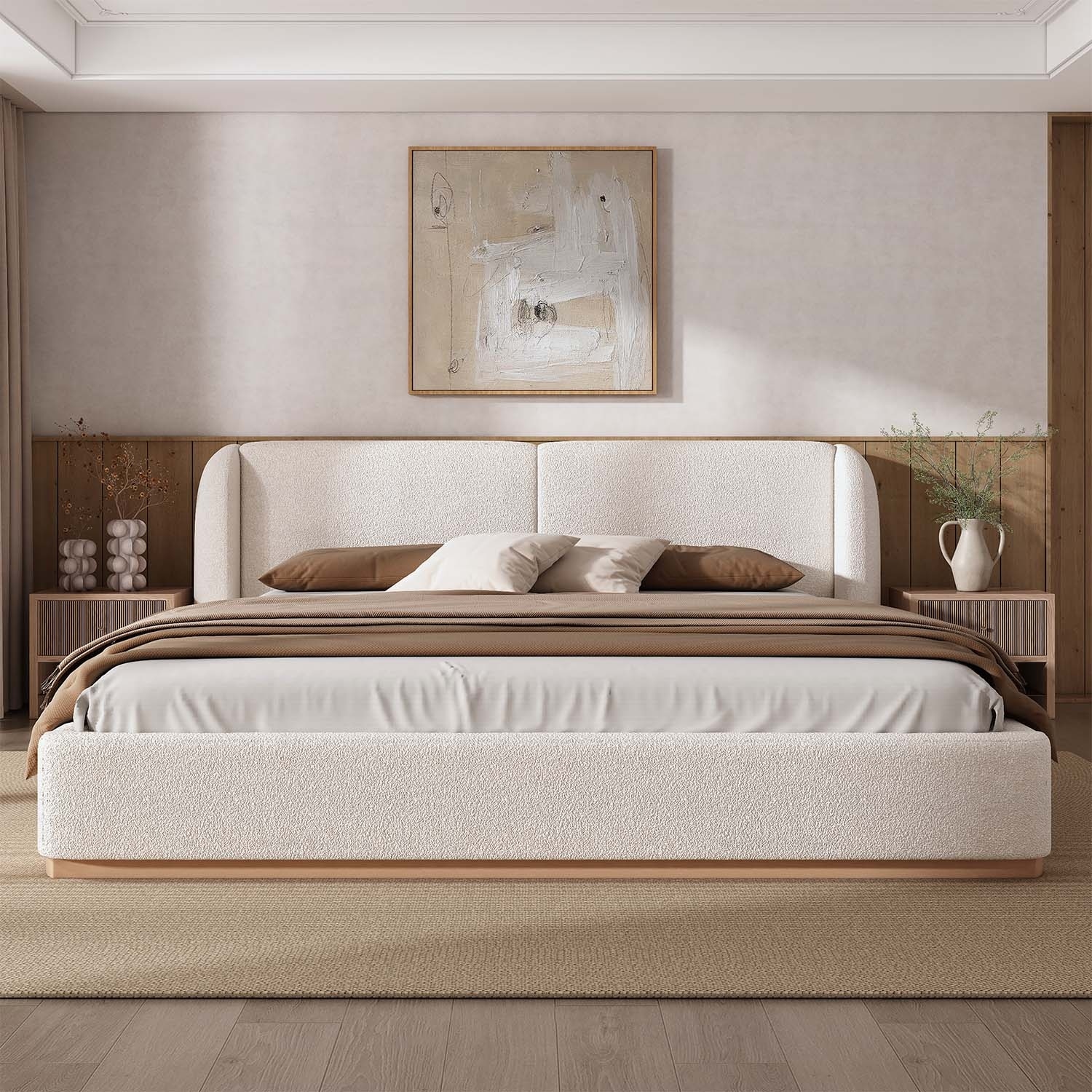 Boucle Bed Frame with LED Light Headboard Charging Station and 4 Storage Drawers