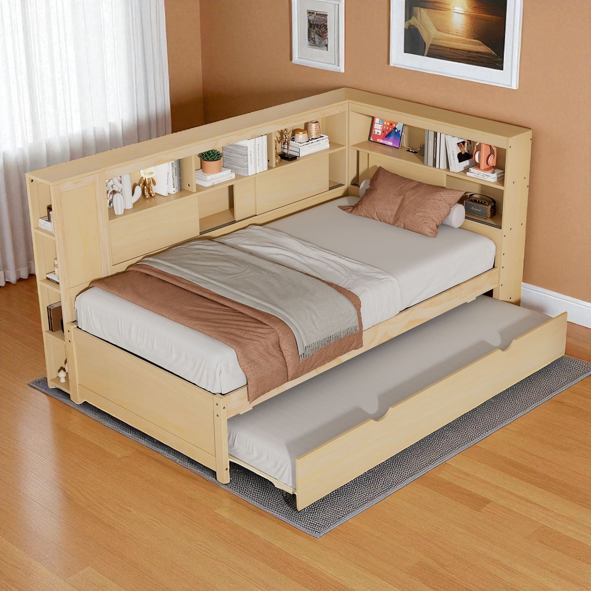 Twin Size Wood Daybed with Trundle, Built-In USB Charging Station and Storage Shelves for Bedroom