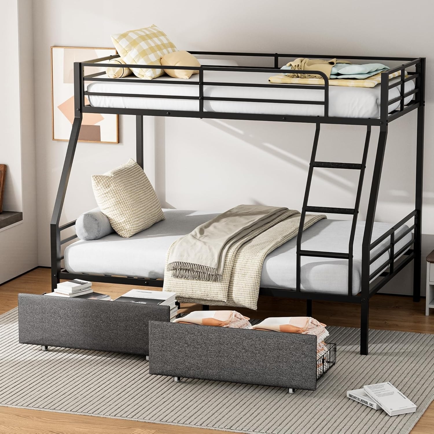 Twin Over Full Bunk Bed with Storage Drawers, Safety Guardrails & Padded Ladder, No Box Spring Needed, Black