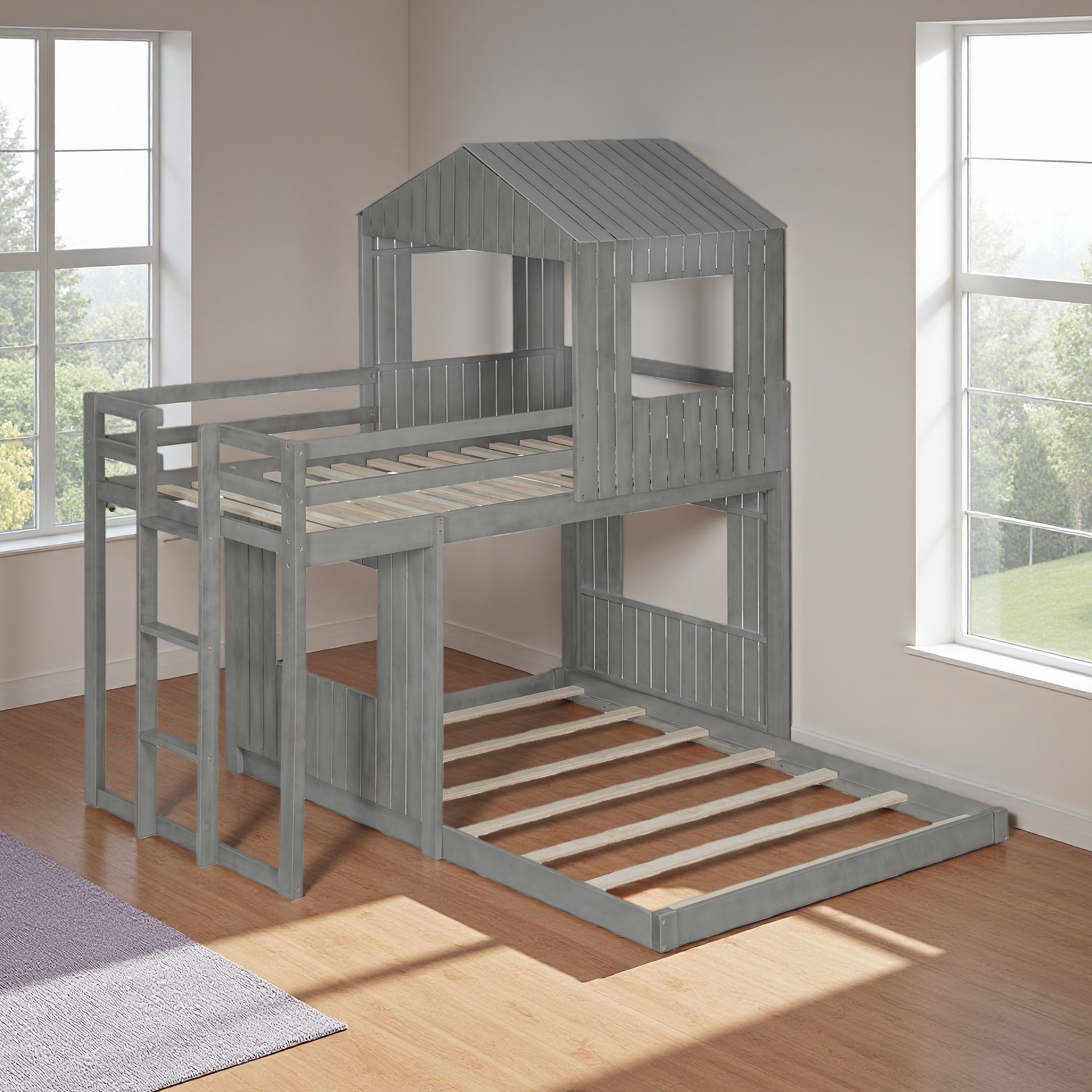 Twin Over Full Solid Wood Bunk Bed with Playhouse, Ladder and Guardrails