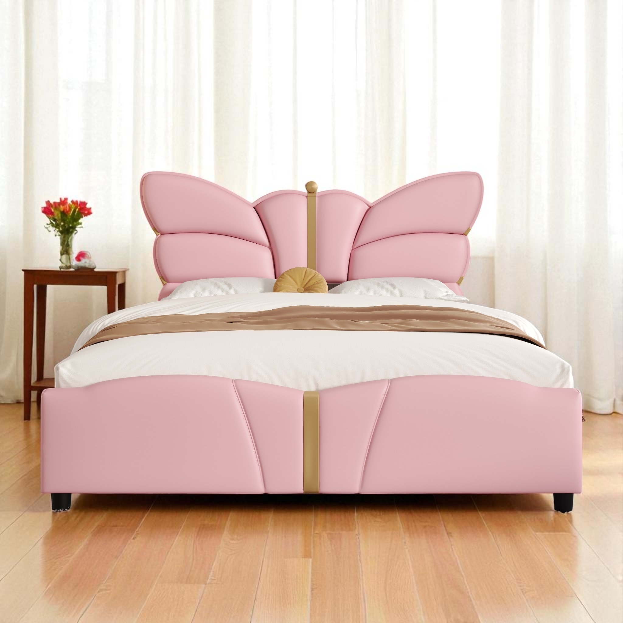 Full Size Upholstered Platform Bed Frame with Butterfly Headboard,PU Leather Design and Gold Metal Accents,No Box Spring Needed
