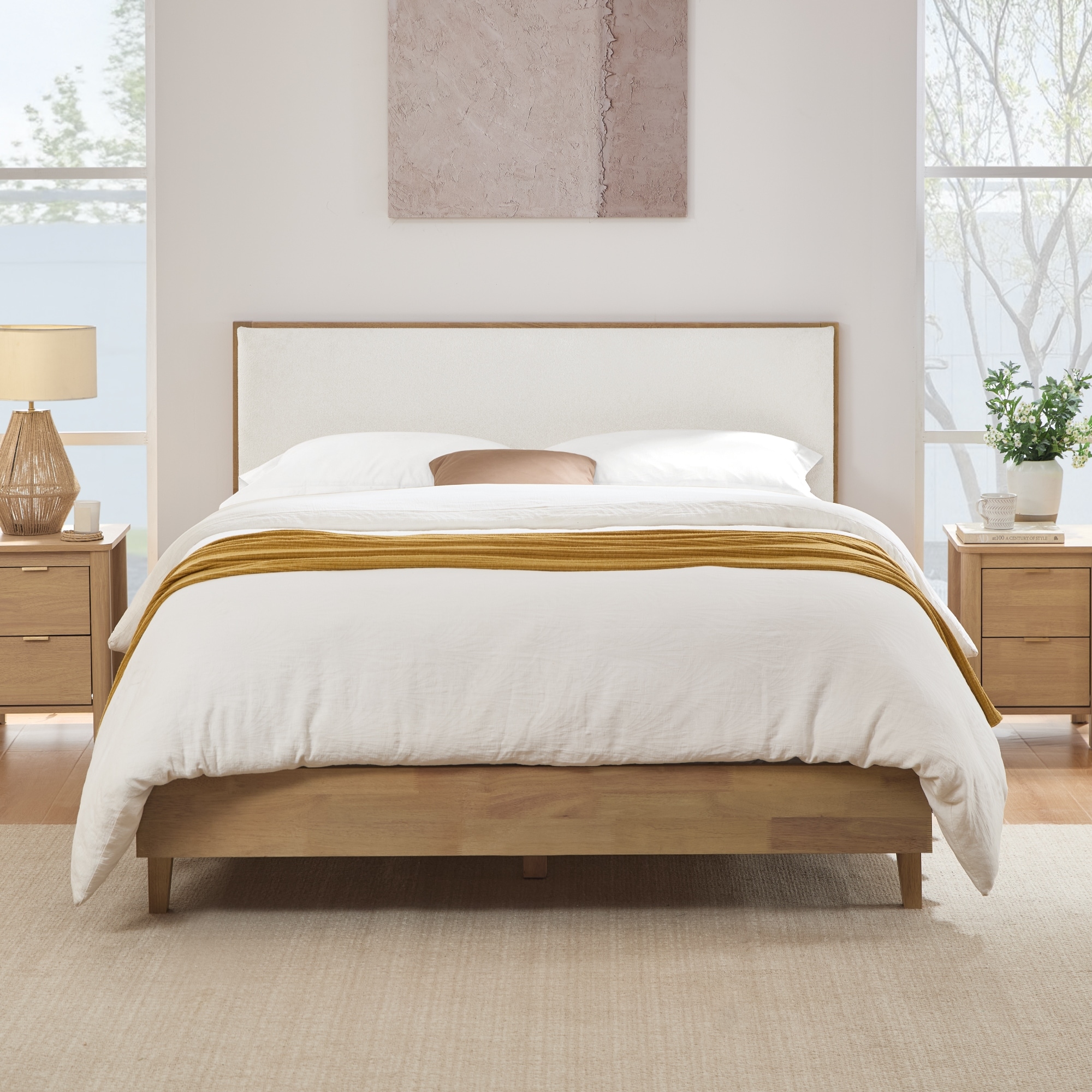 Modern Bouclé Platform Bed with Upholstered Headboard & Solid Wood Frame