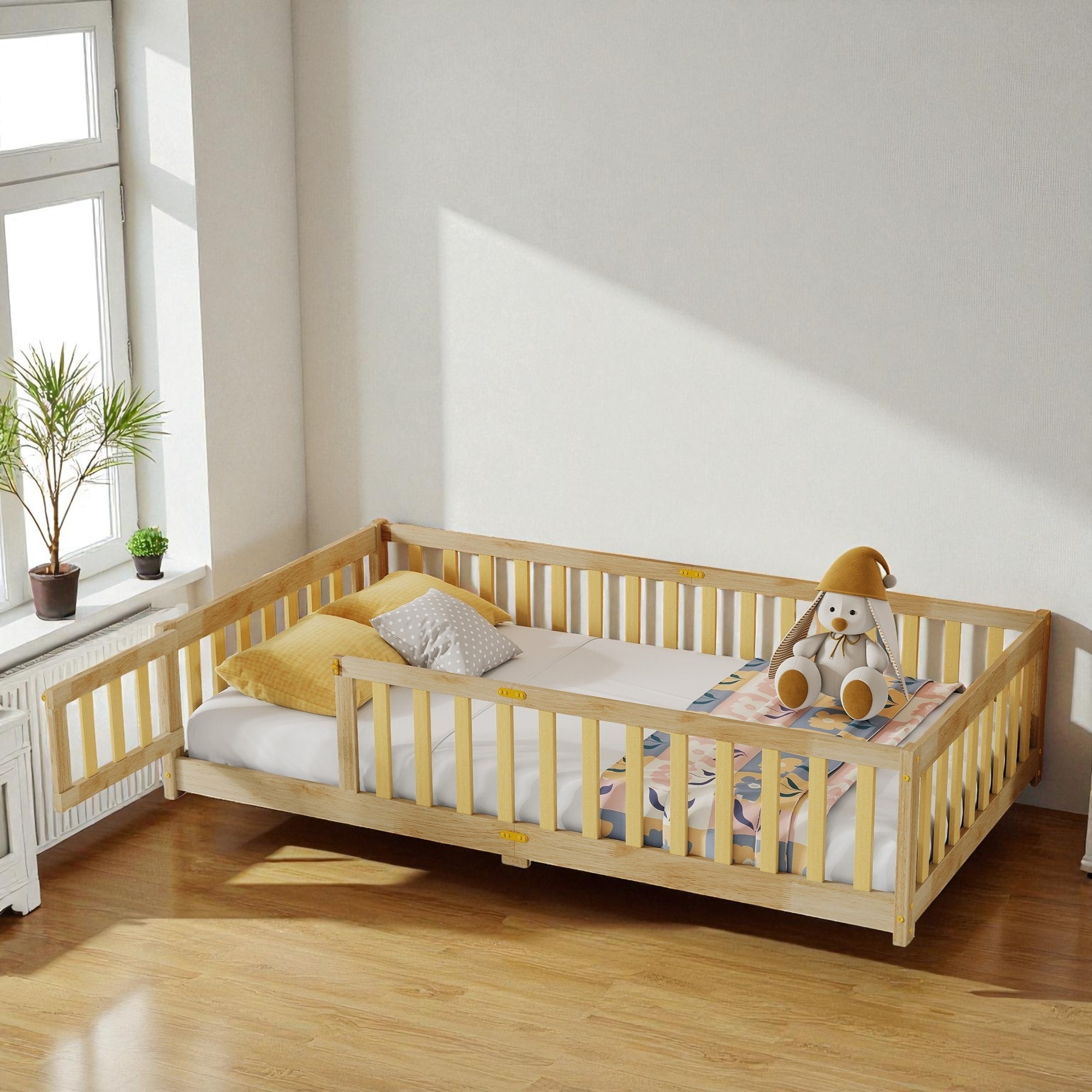 Twin Size Floor Bed with Fence and Door, Rubber Wood Platform Bed with Guardrails and Slats for Kids or Toddlers