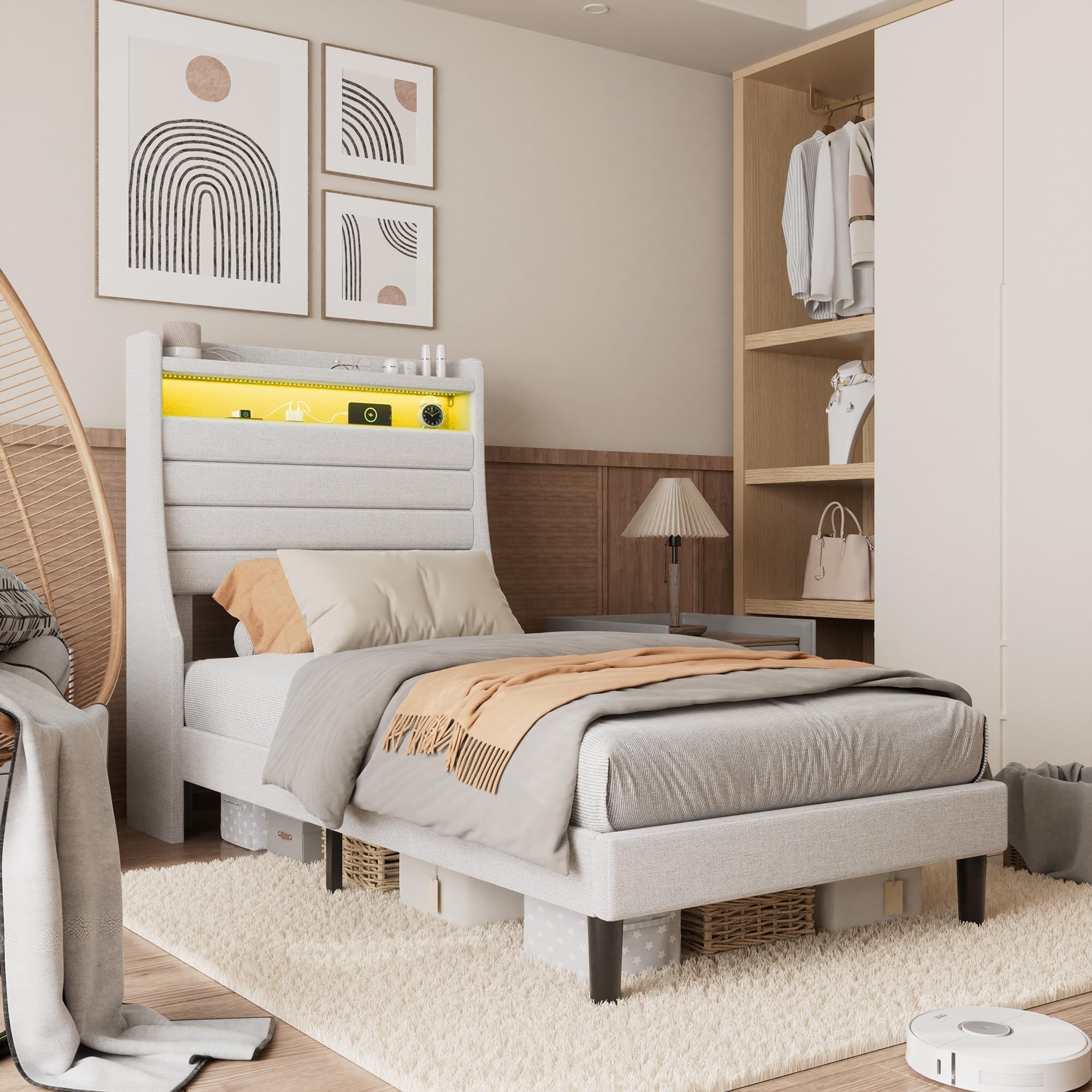 Bed Frame with Charging Station, LED Lights & Upholstered Storage Headboard, No Box Spring Needed