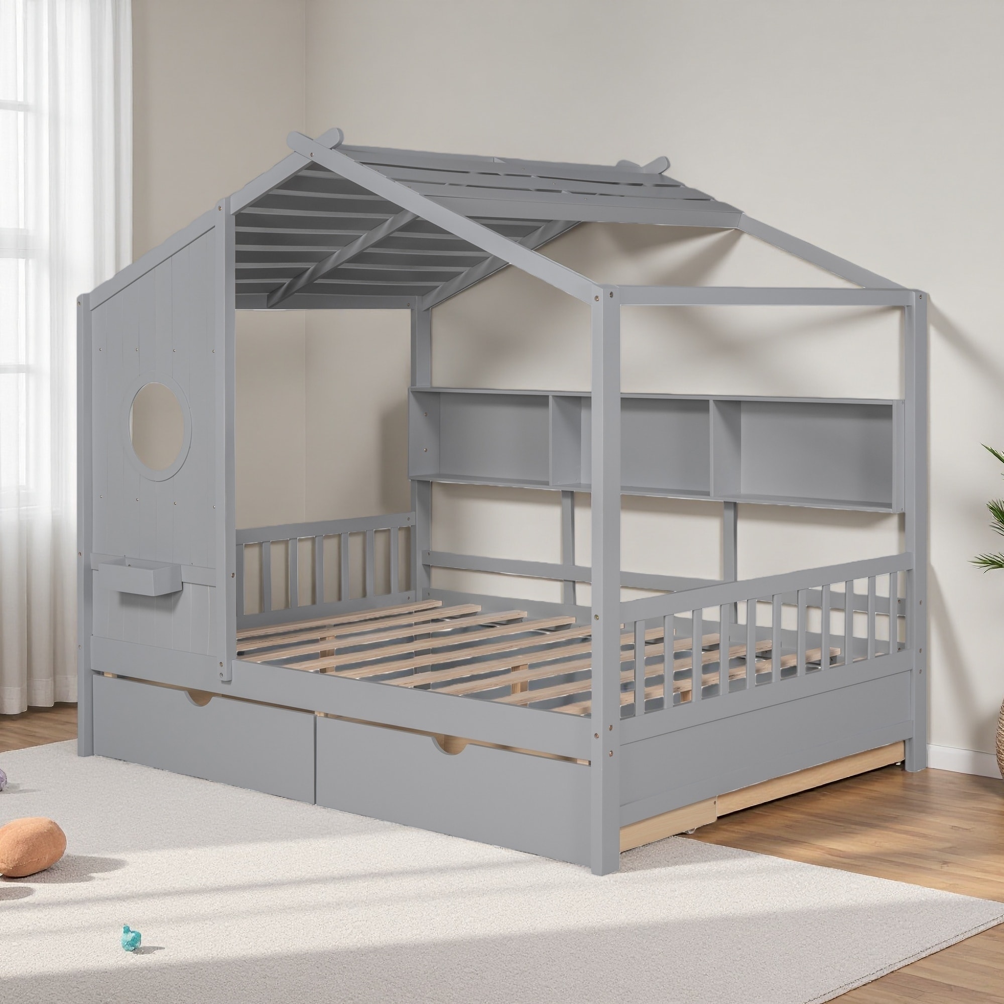 Full Gray Wooden House Bed with Roof & 2 Drawers
