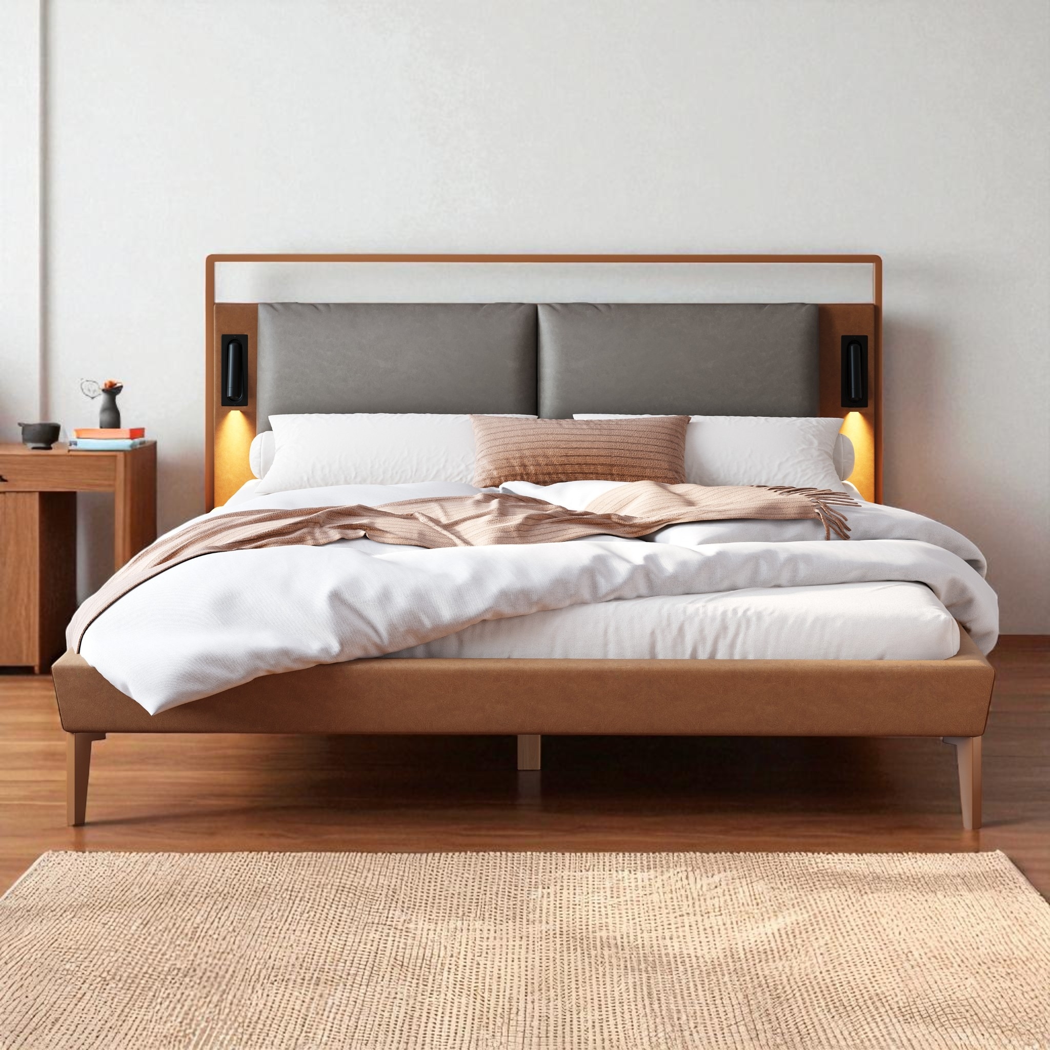 Queen Upholstered Platform Bed Frame with Faux Leather Headboard, Adjustable LED Lights, Slatted Support, No Box Spring Needed