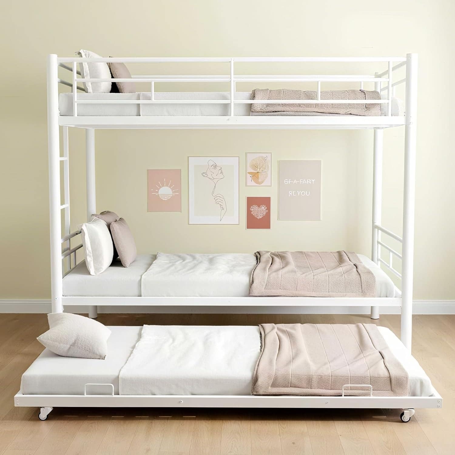 Twin Over Twin Bunk Bed with Trundle, Metal Frame, Safety Guard Rail, 3 in 1 Design, No Box Spring Needed, White