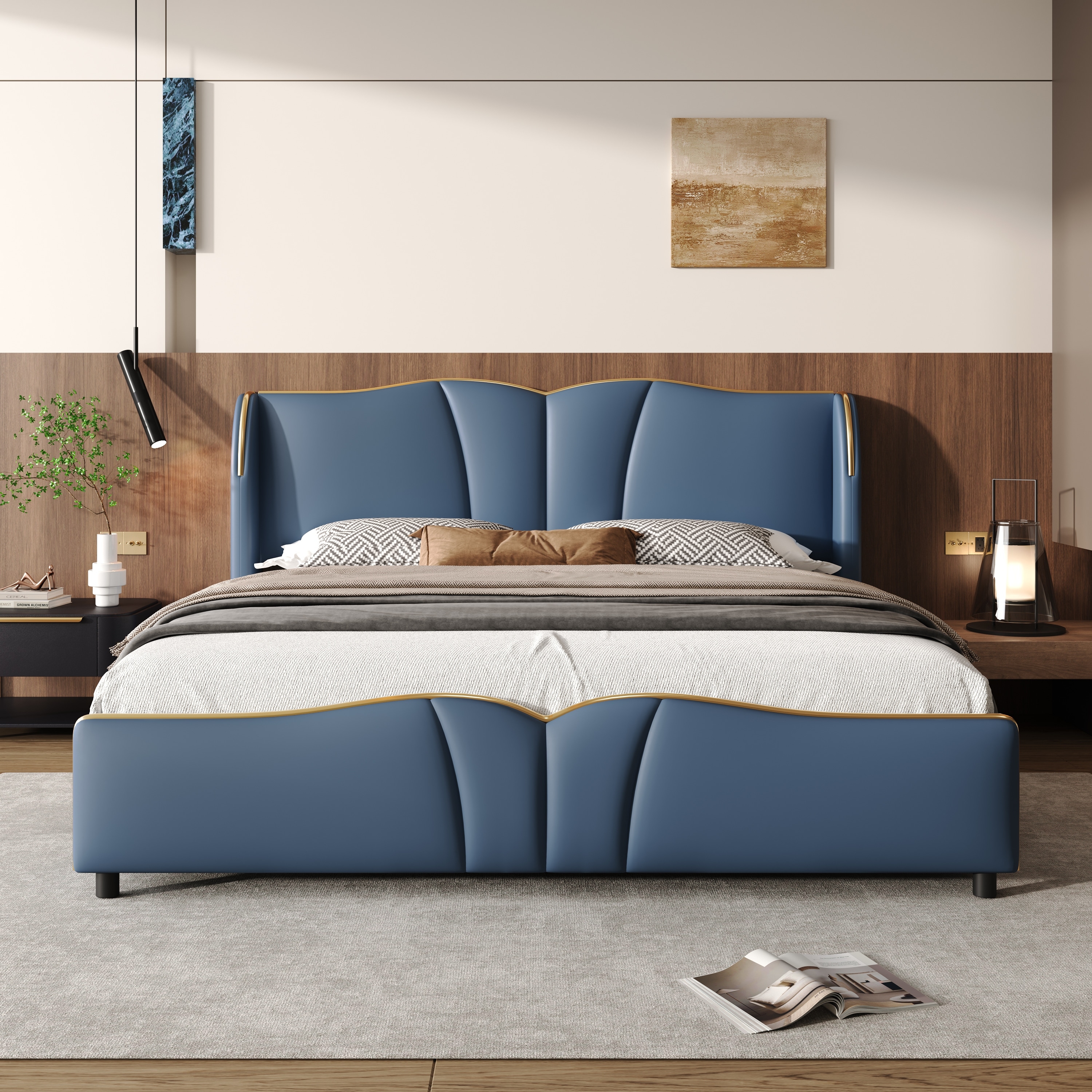 Leather Upholstered Bed Frame,Modern Bed Frame with Wingback Headboard and Wavy Footboard