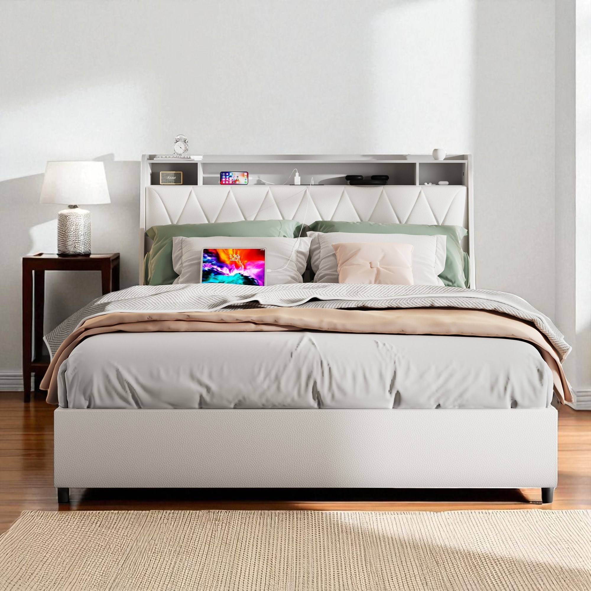 White Color Velvet Upholstered 1pc Bed Curved Design Headboard Storage FB Bedroom Furniture Bedframe