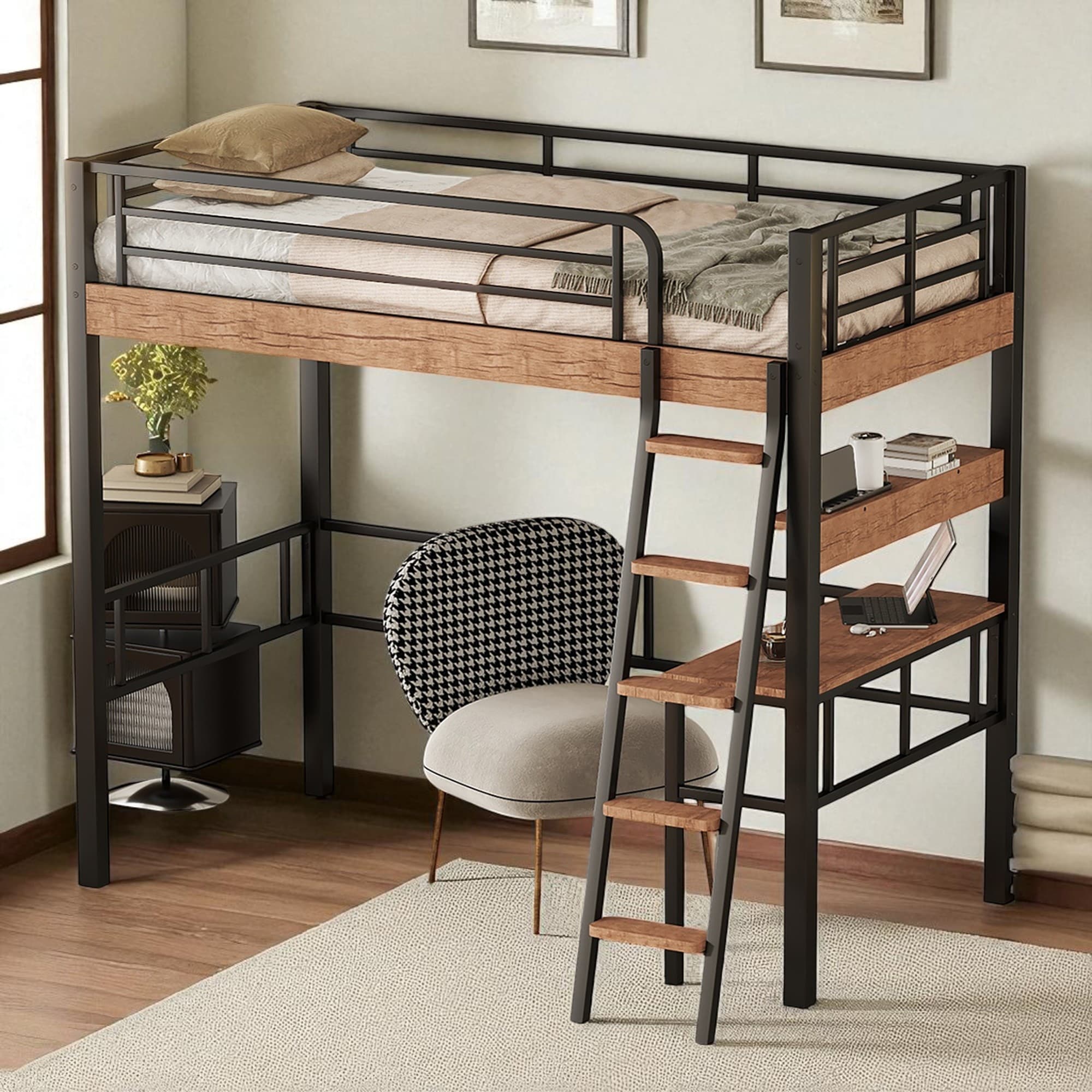 Twin Size Metal Loft Bed with Built-in Desk, Storage Shelf and Ladder, Space-Saving Frame for Bedroom or Dorm