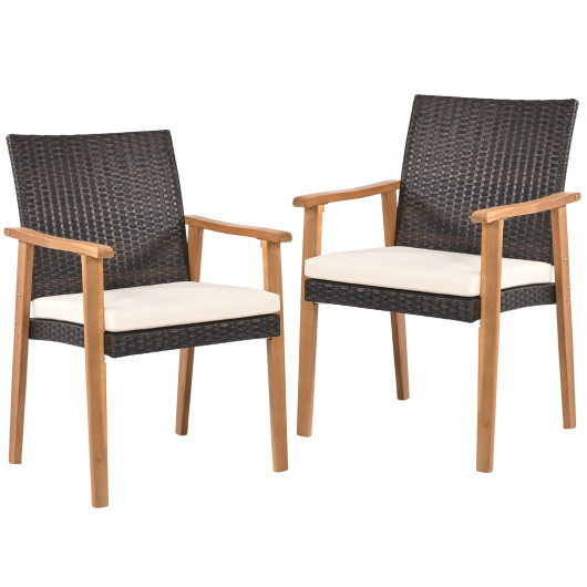 Costway PE Rattan Outdoor Patio Dining Chair Set of 2 with Removable Cushion and Acacia Wood Armrests-White