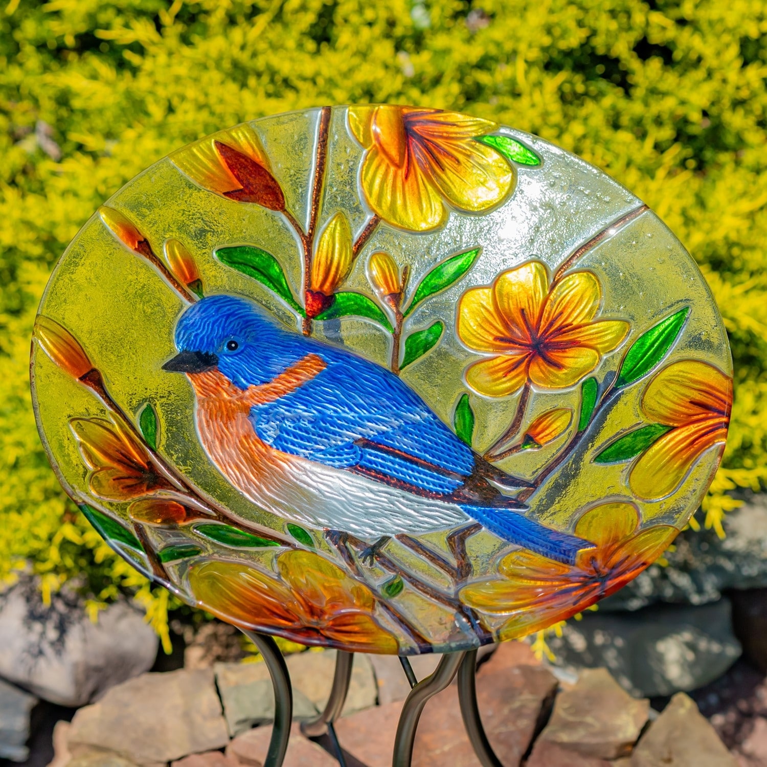 18" Glass Bowl Bluebird Birdbath with Metal Stand "Idaho"