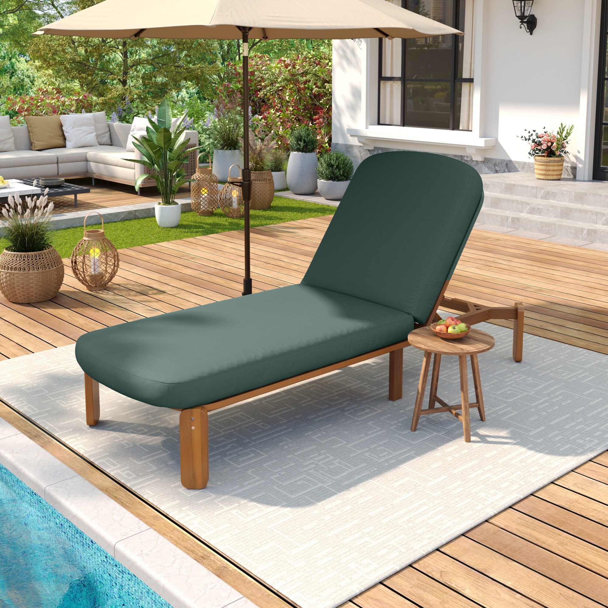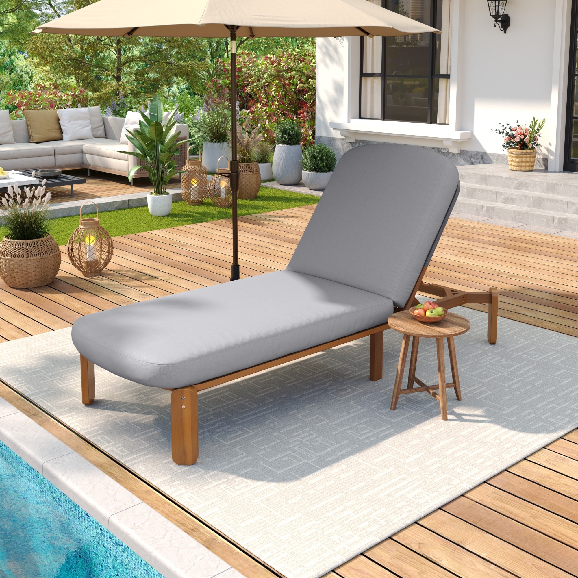 Roomfitters Modern Adjustable Outdoor Chaise Lounge Chair with Solid Wood Frame & Thick Grey Cushion for Patio Poolside