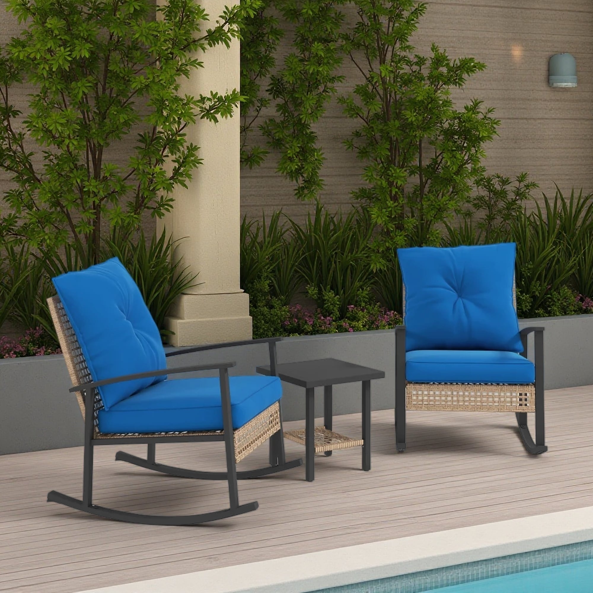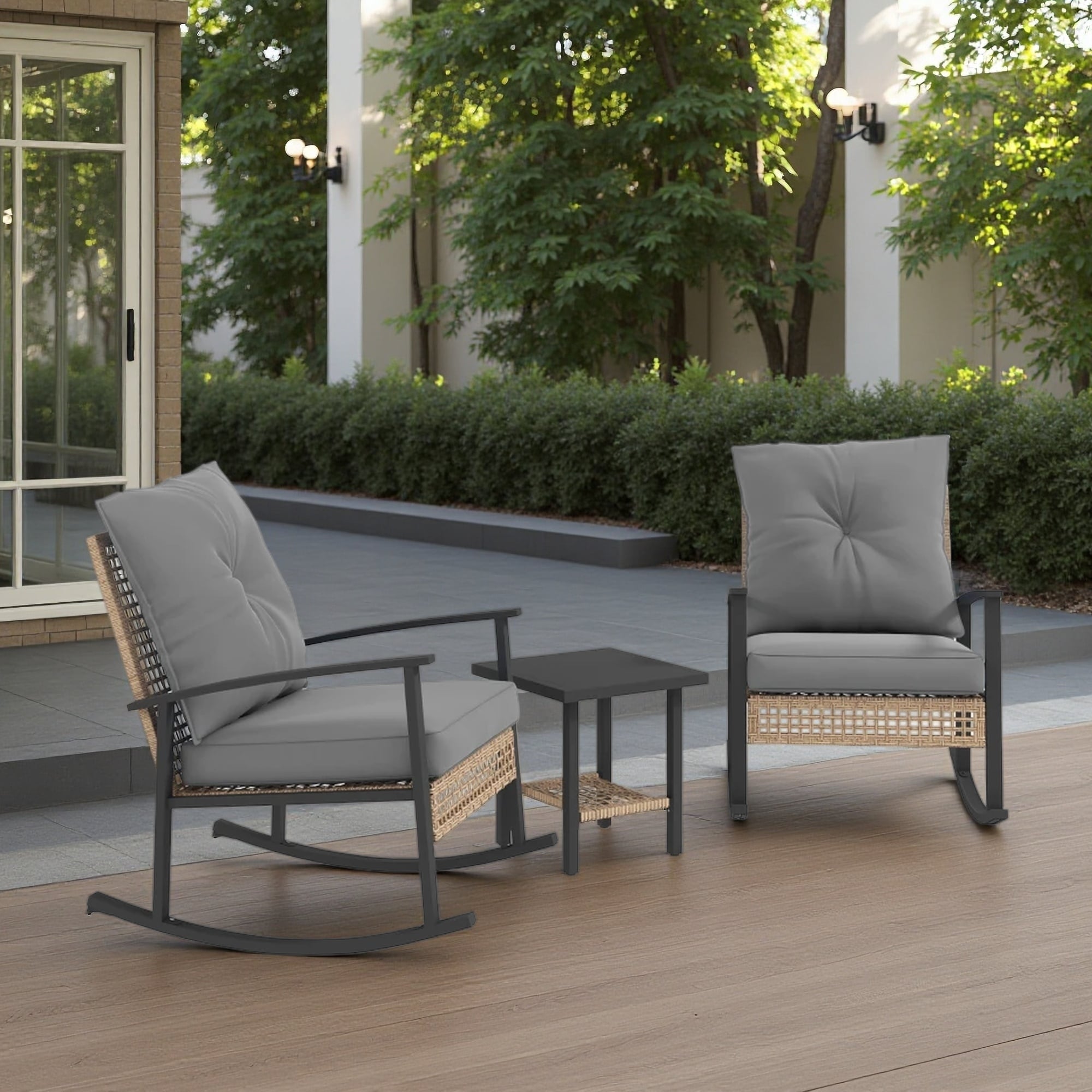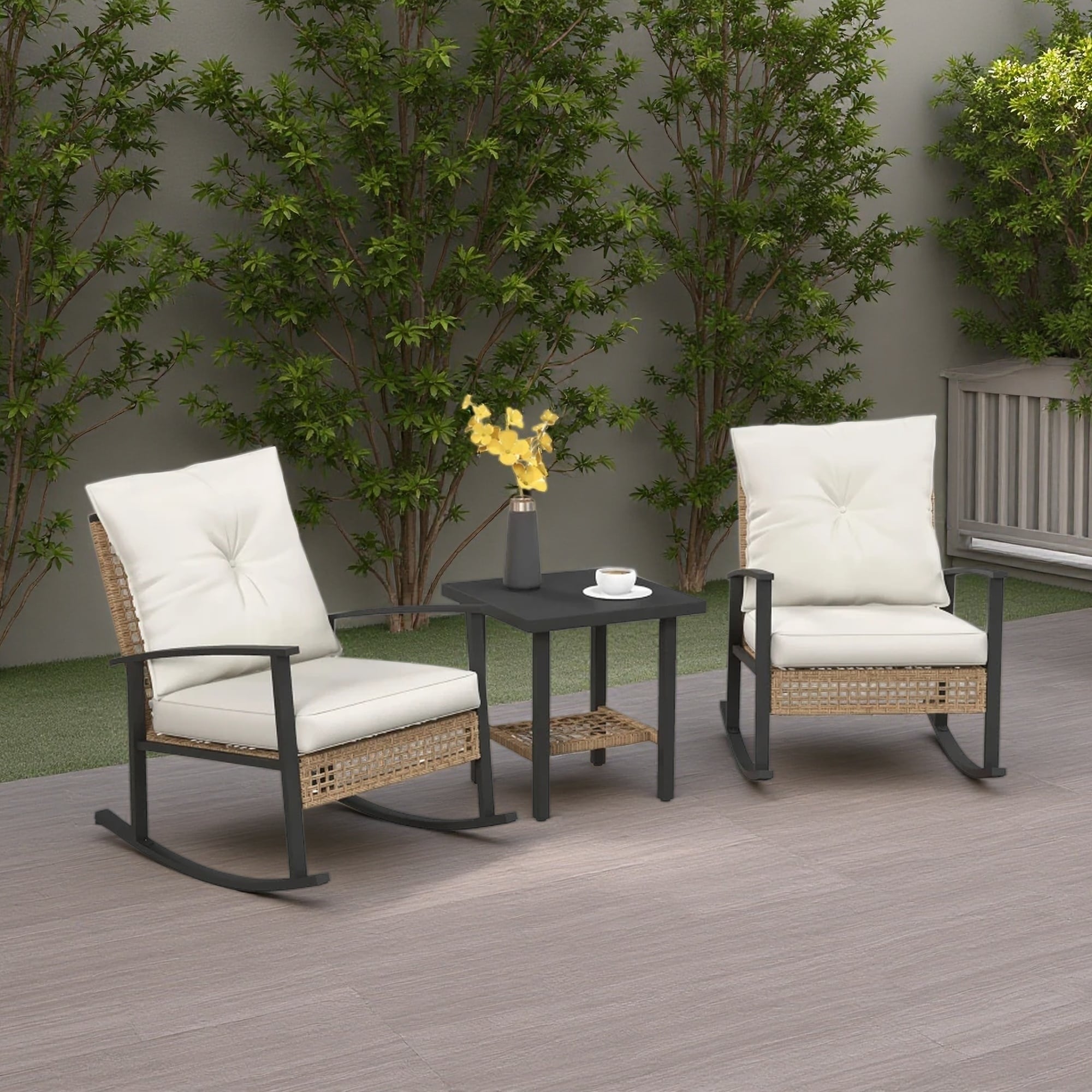 3-Pieces Patio Bistro Set with Rattan Rocking Chairs and Coffee Table