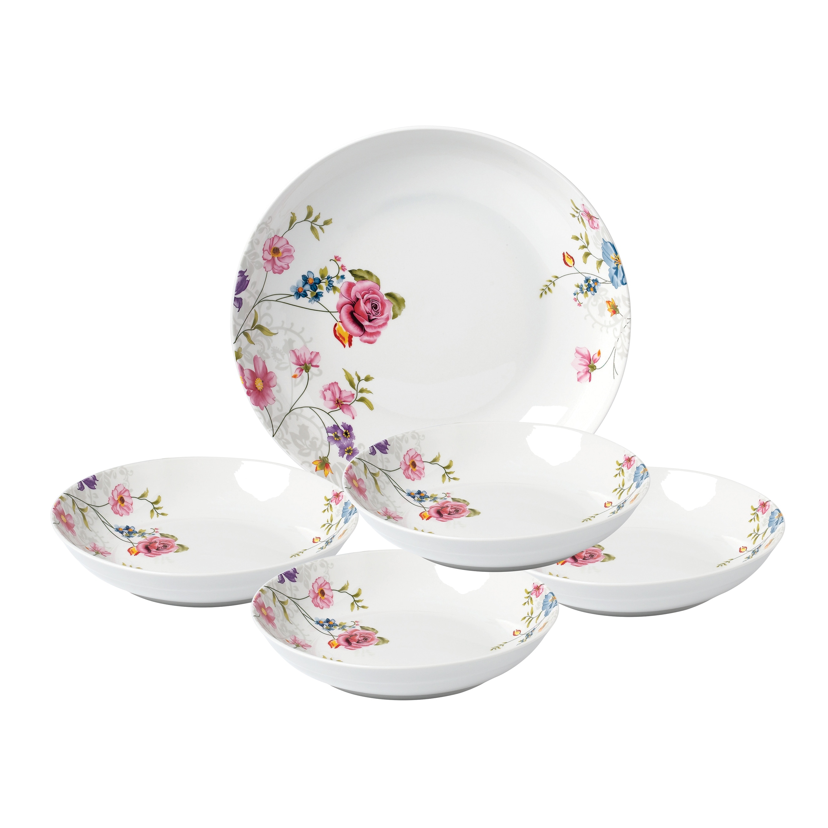 Lorren Home Trends 5 Piece Porcelain Pasta Set, 1 Serving Bowl and 4 Individual Bowls, Floral Design