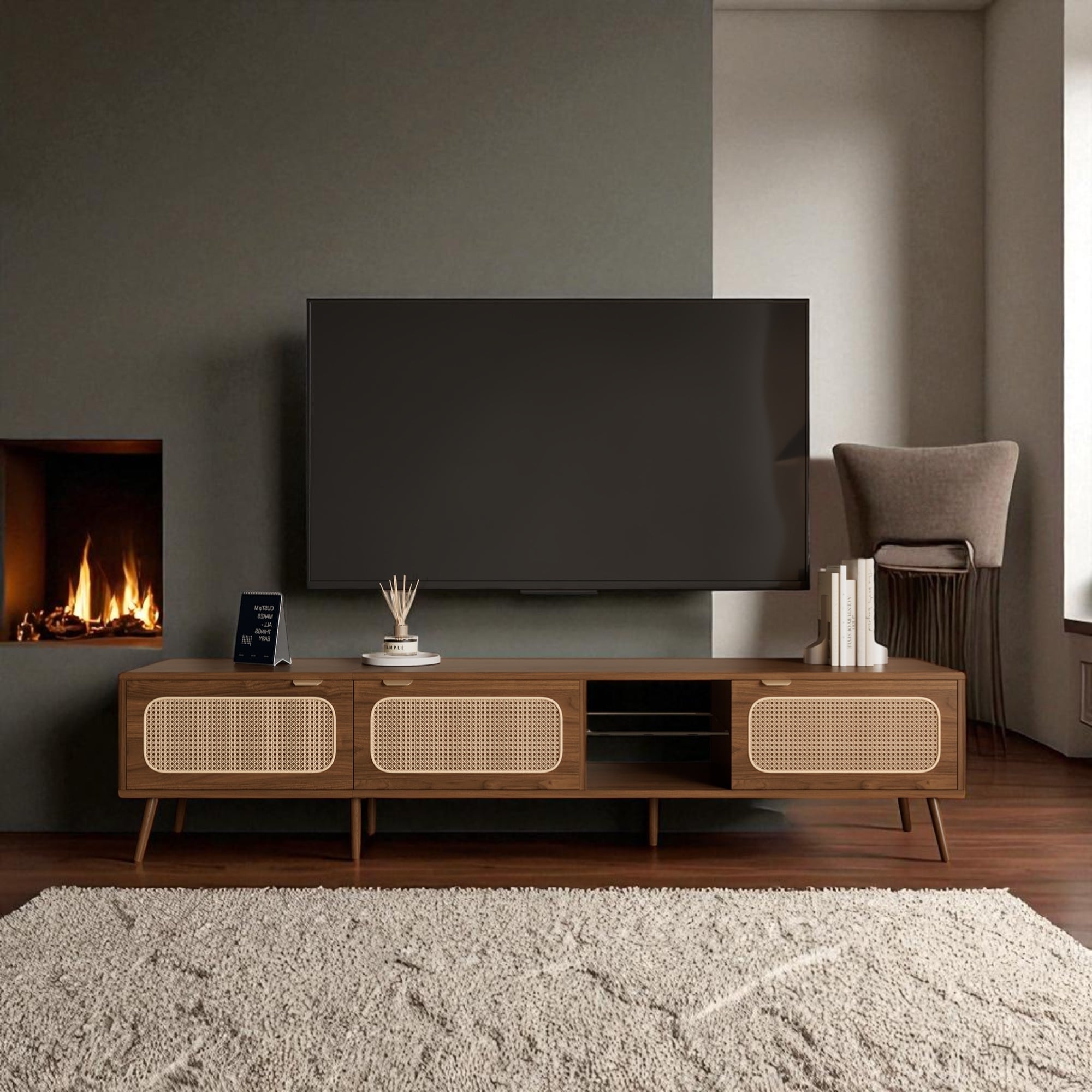 78'' Rattan-Inspired TV Console for 75-85'' TVs, Glass Shelf Entertainment Center with Soft-Close Doors, Wood Media Cabinet