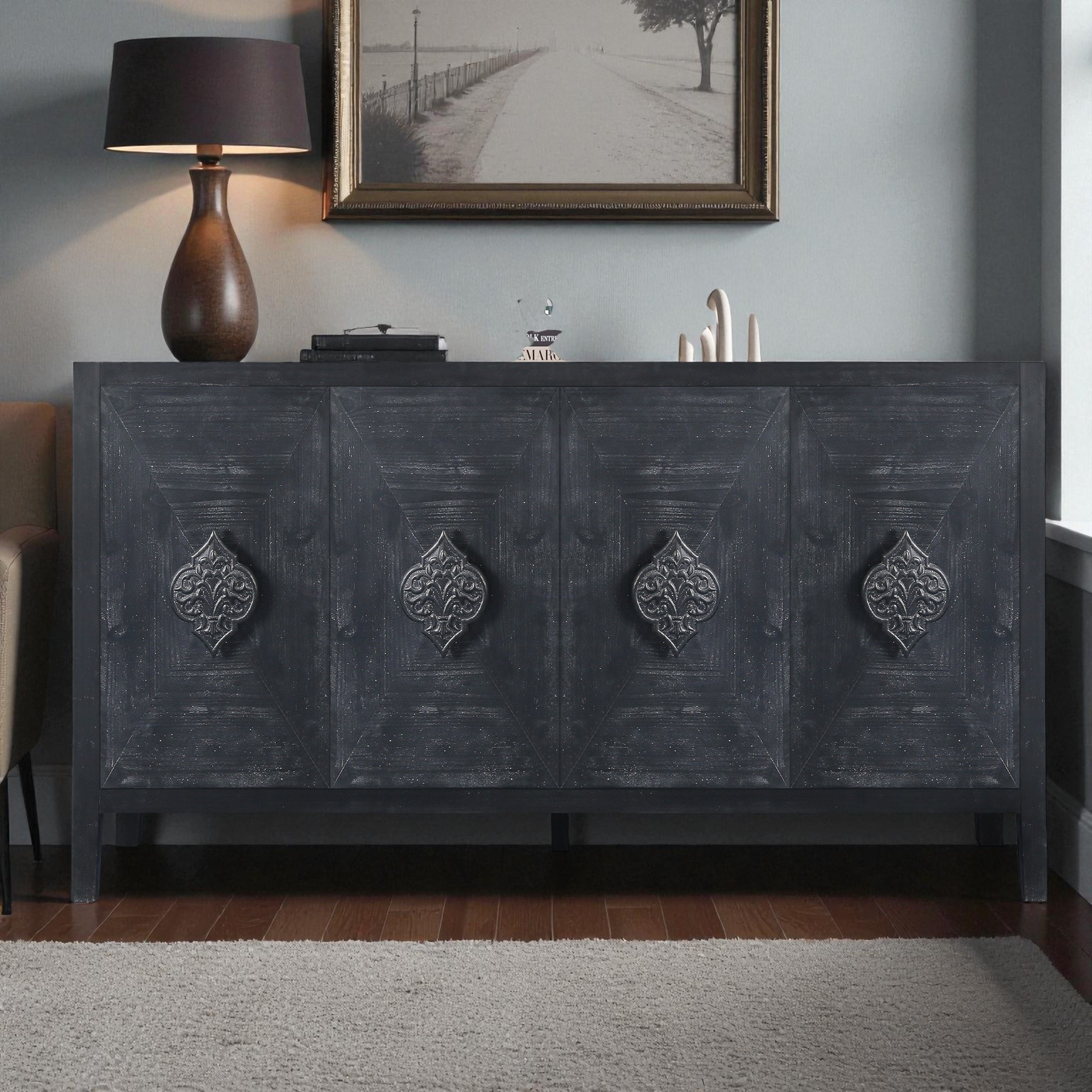 59.8" Antique 4-Door Sideboard Buffet Cabinet with Carved Flower Handles, Pine Veneer Storage Console for Living Room
