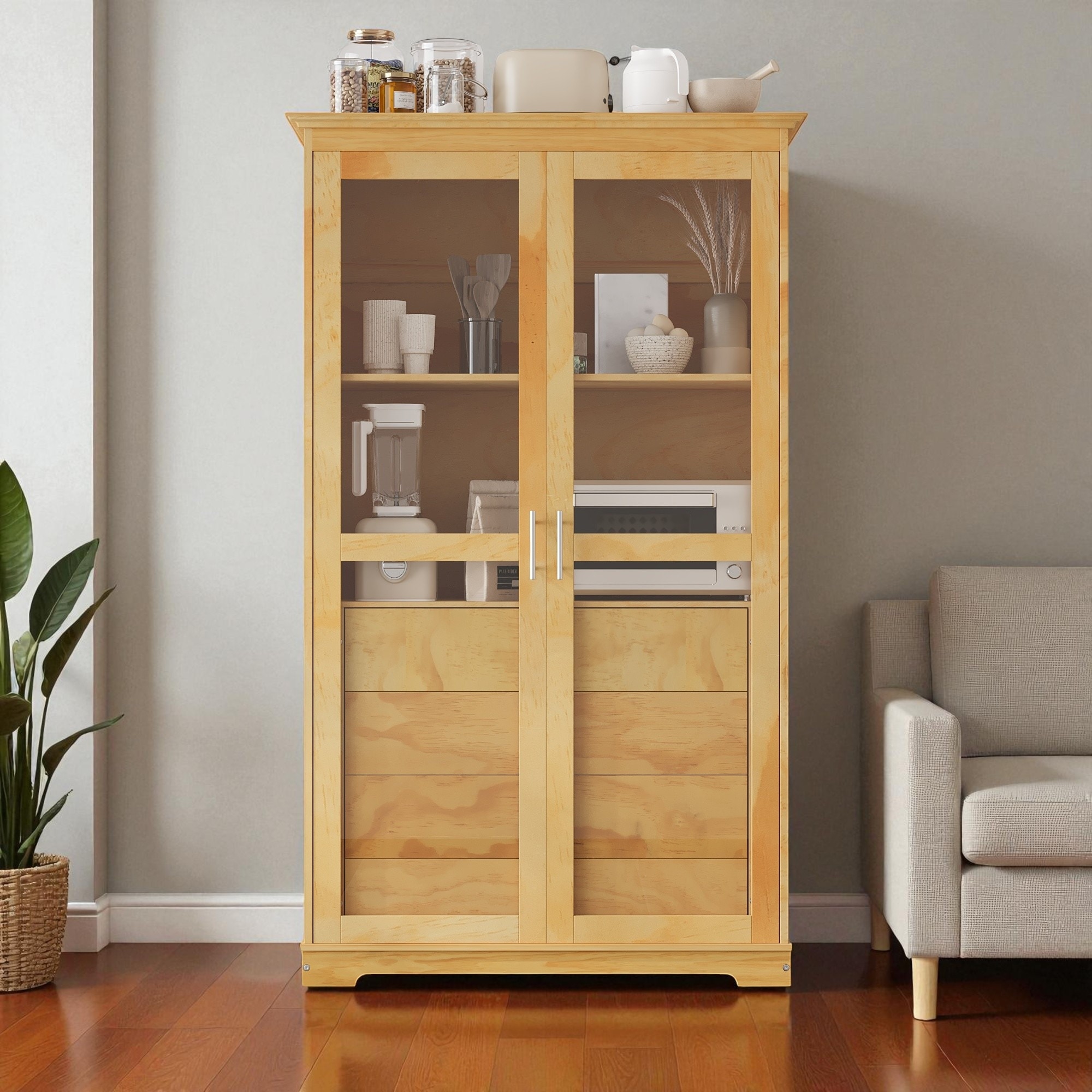 75" Solid Pine Wood Kitchen Pantry Cabinet with Glass Doors and 4 Drawers, Freestanding Storage Display Cabinet for Dining Room