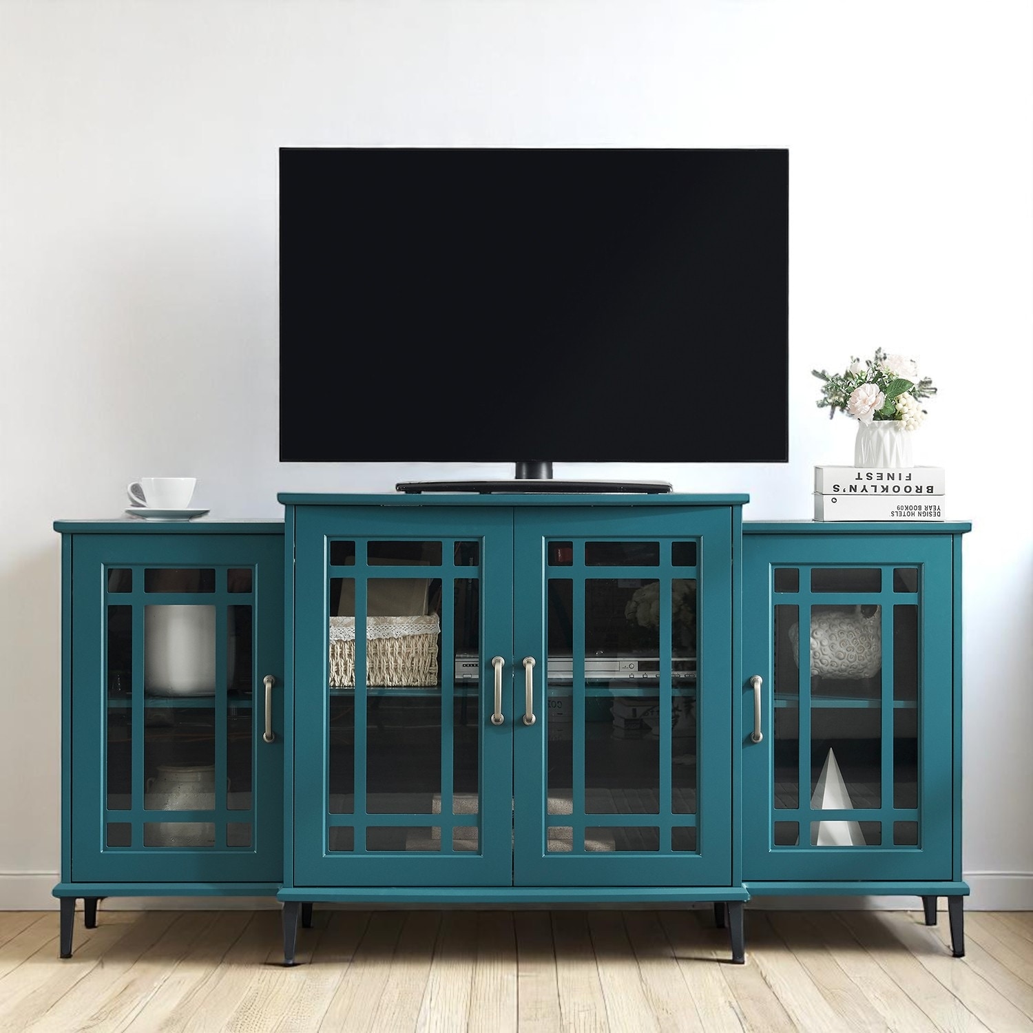 62" Teal Blue TV Stand with Glass Doors and Adjustable Shelves, Modern Buffet Cabinet with Cable Management and Ample Storage