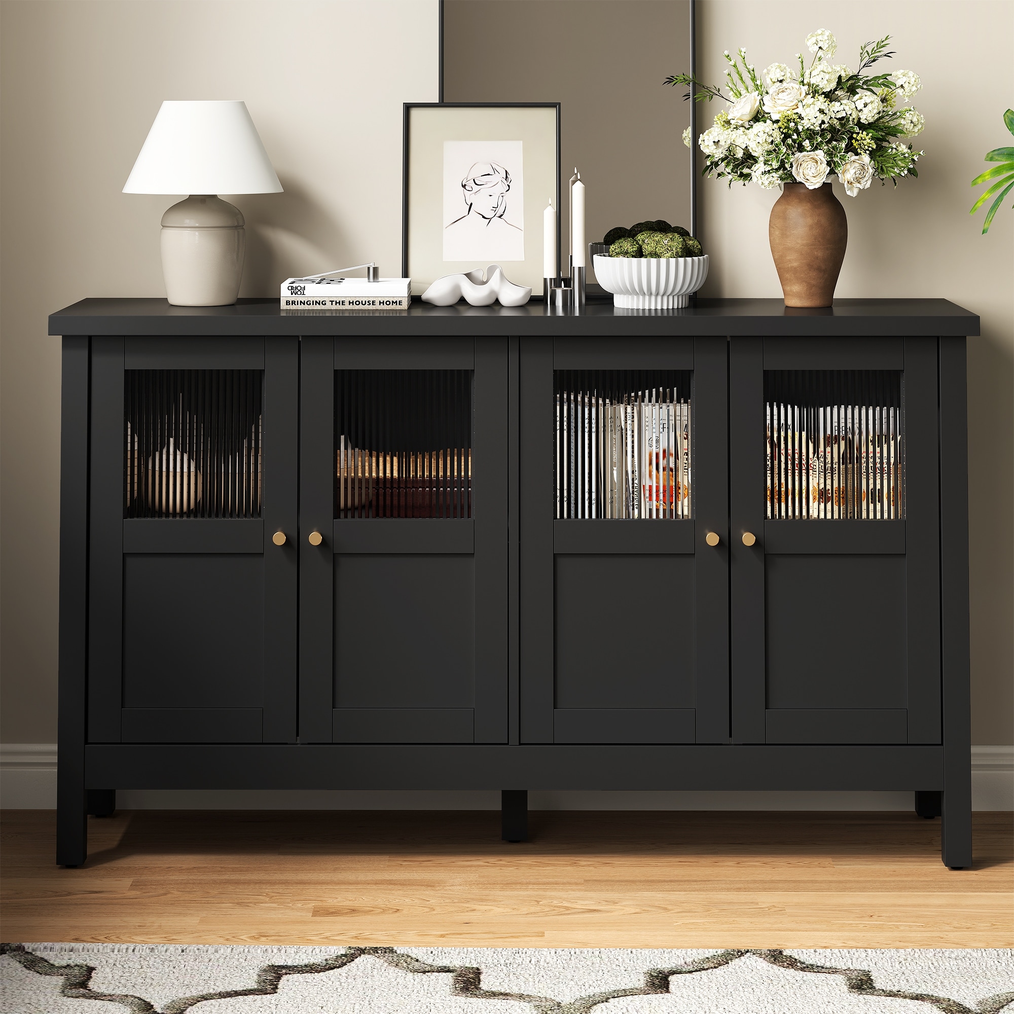 Teamson Home Tremolo 55 in. W Fluted 4-Door Sideboard Cabinet with Adjustable Shelves for Dining Room or Living Room Storage