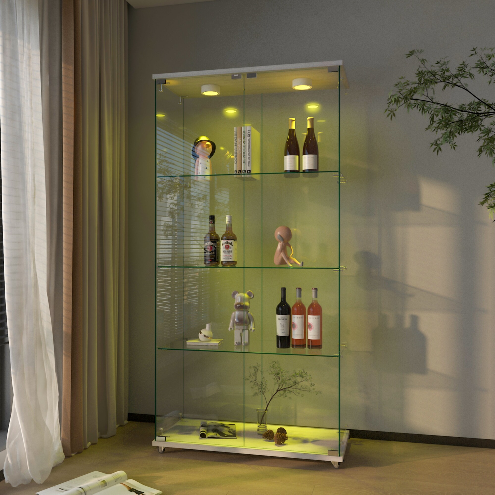 Modern Glass Display Cabinet with LED lights, Quick-assembly Antique Cabinet, Tempered Glass Bookshelf, 2-door 4-shelf