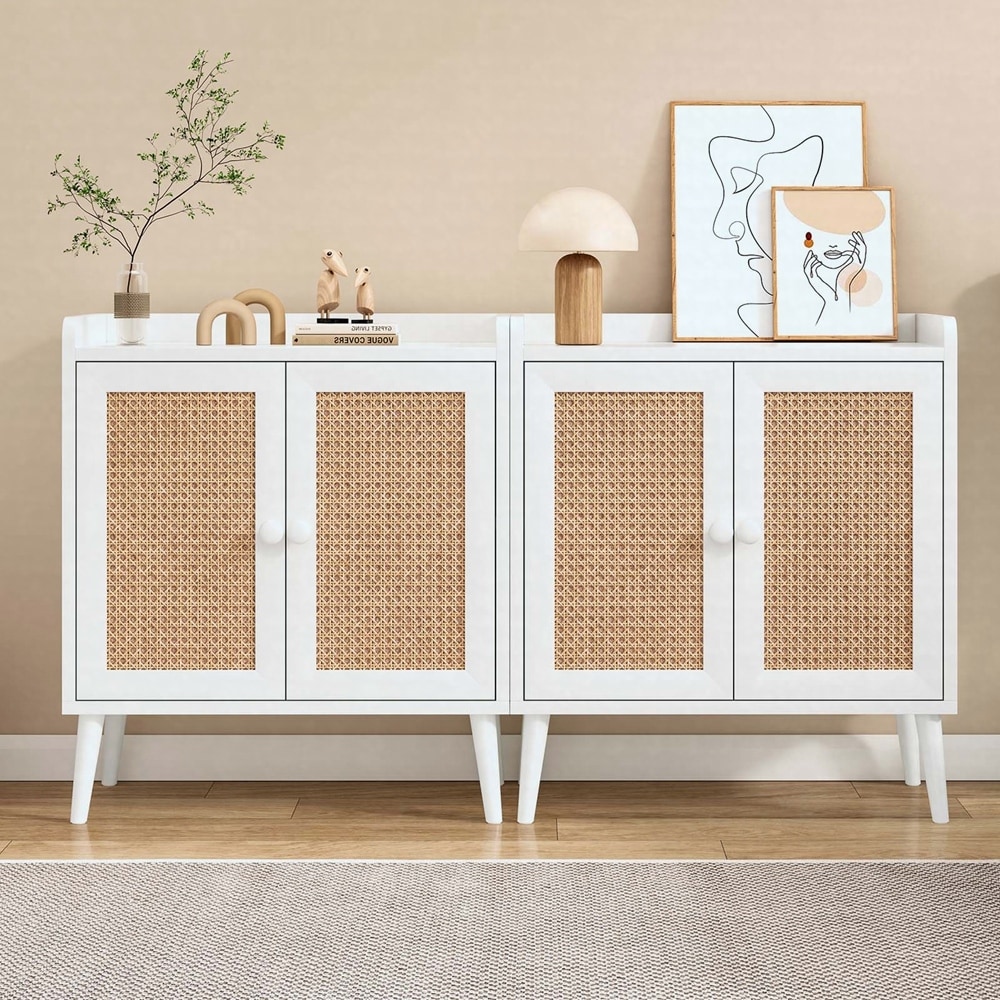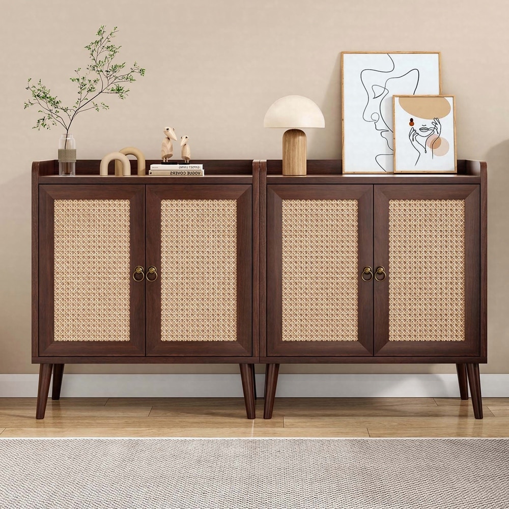 Rattan Sideboard Buffet Cabinet - Bar & Liquor Storage Console, Credenza with Decorative Doors