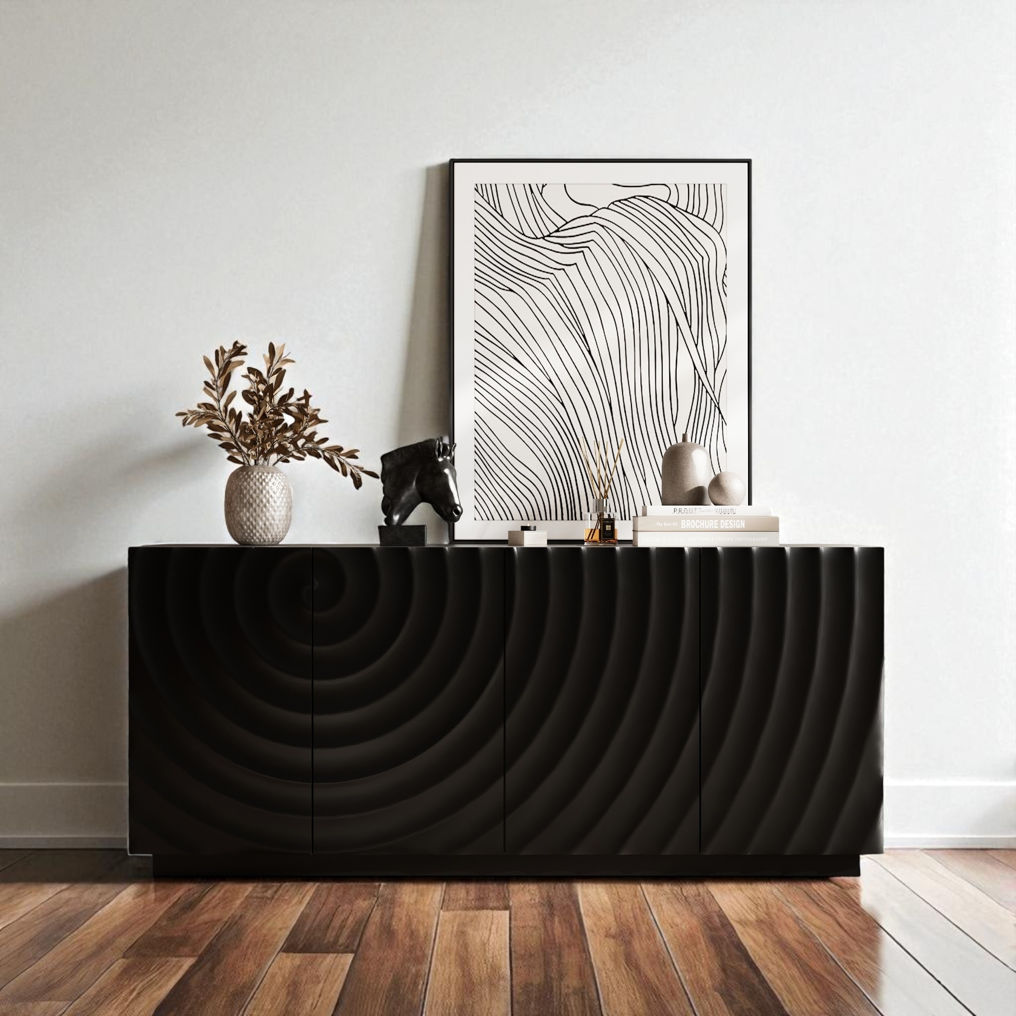 Mid-Century Modern Wave 3-Door 55.1-Inch Wide Kitchen Sideboard Cabinet with Metal Legs - 33.9" H x 55.1" W x 15.7" D