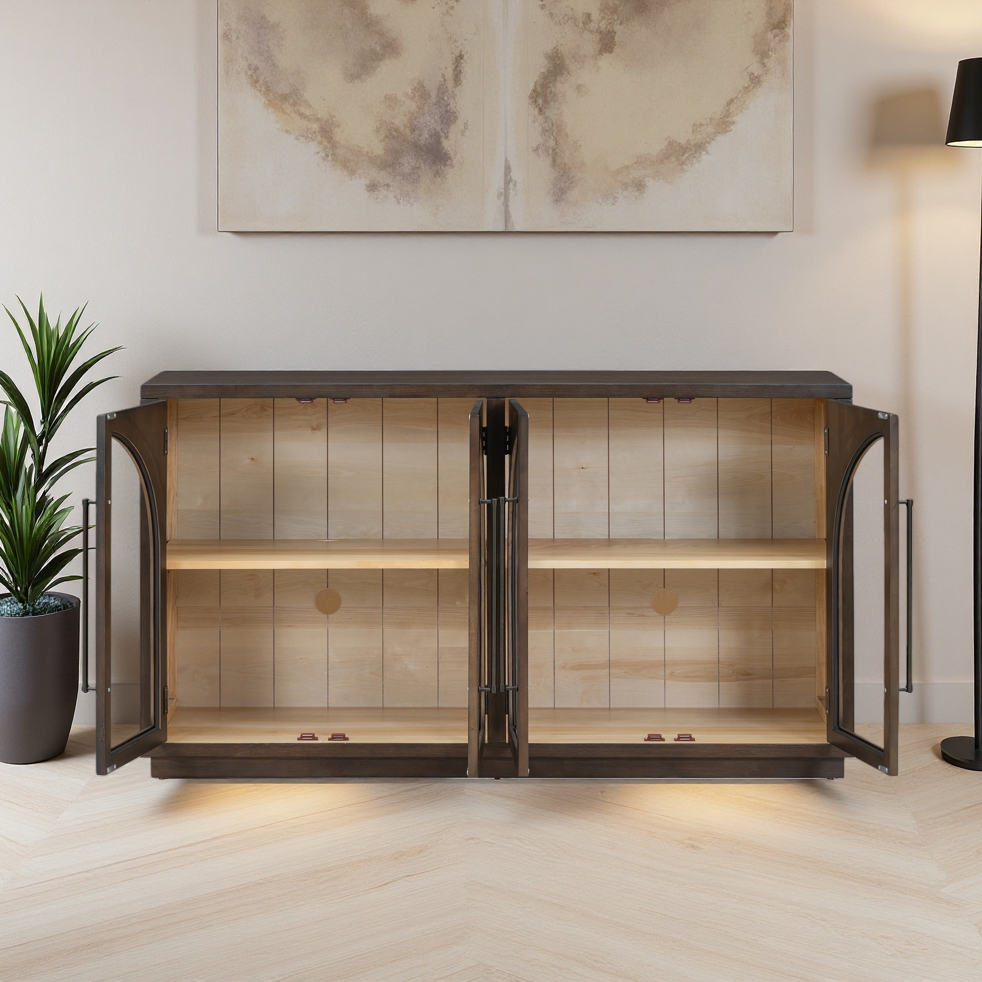 4-Door Retro Sideboard Buffet Cabinet with Arched Glass Doors, Adjustable Shelves, MDF & Rubber Wood Storage for Kitchen