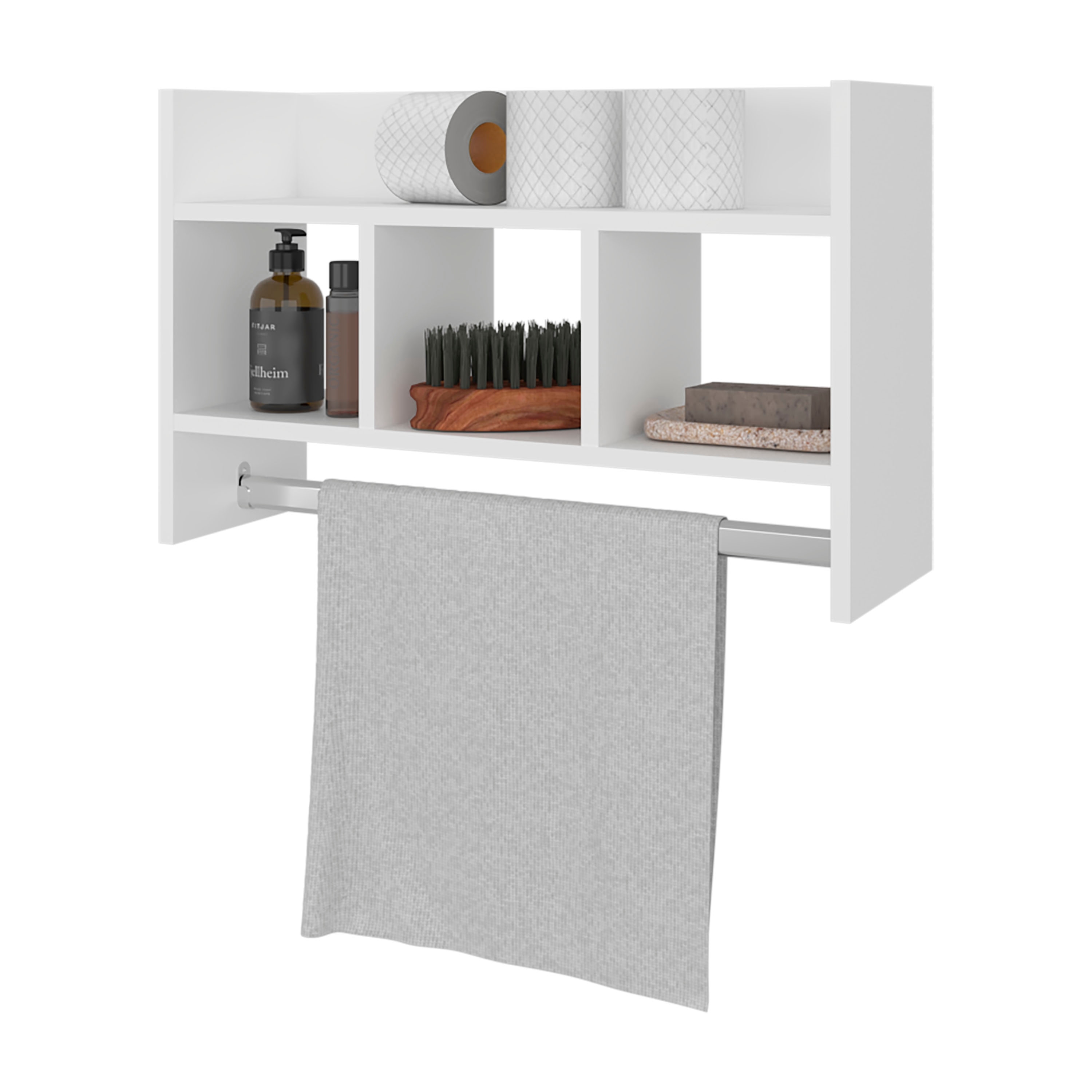 Bath Shelf With Towel Bar, Open Shelves, And Storage Space For Bathroom Items, White