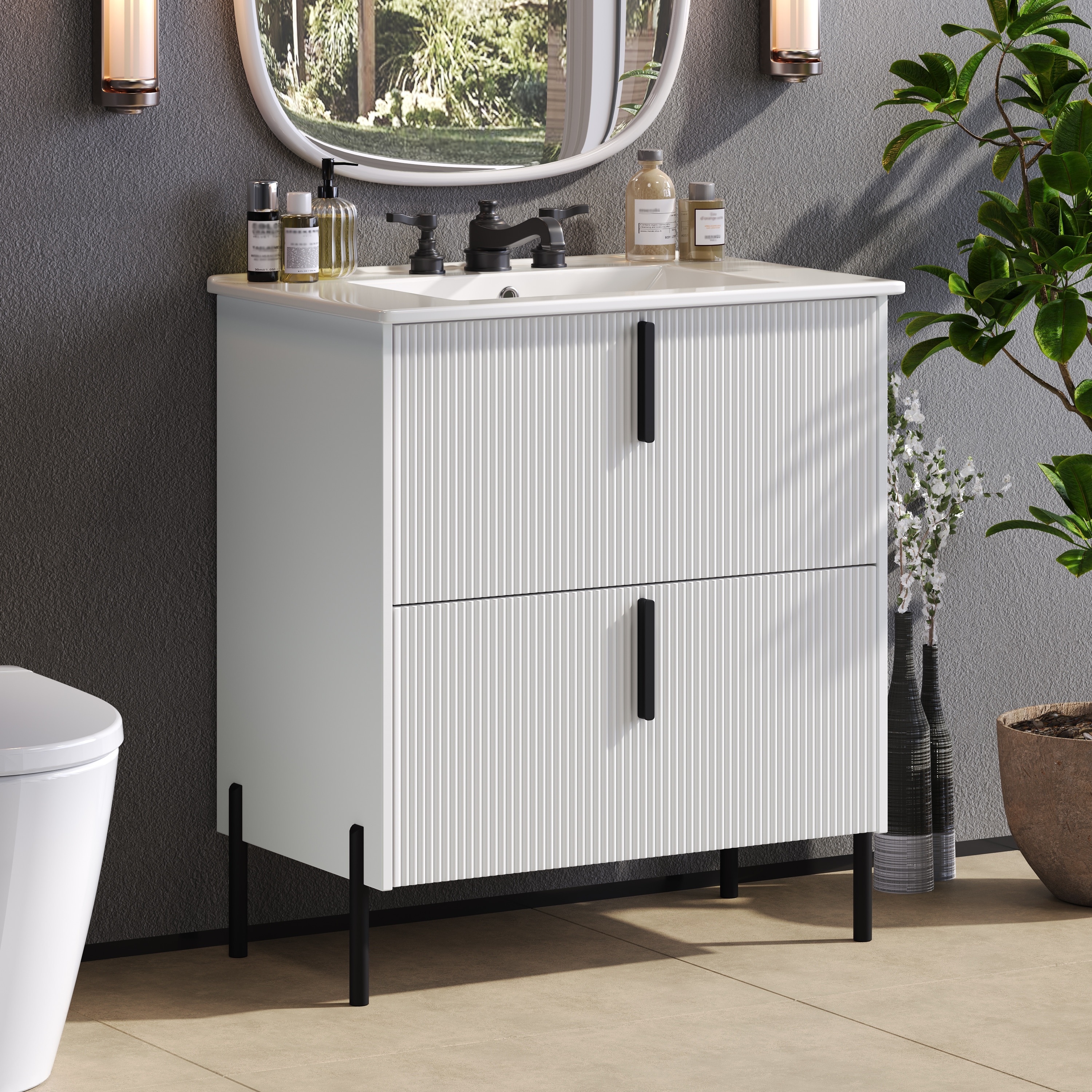 30" Bathroom Vanity with Ceramic Sink and Full-Extension Drawers, Soft Close Undermount Drawer Slides, Fluted Design, Green