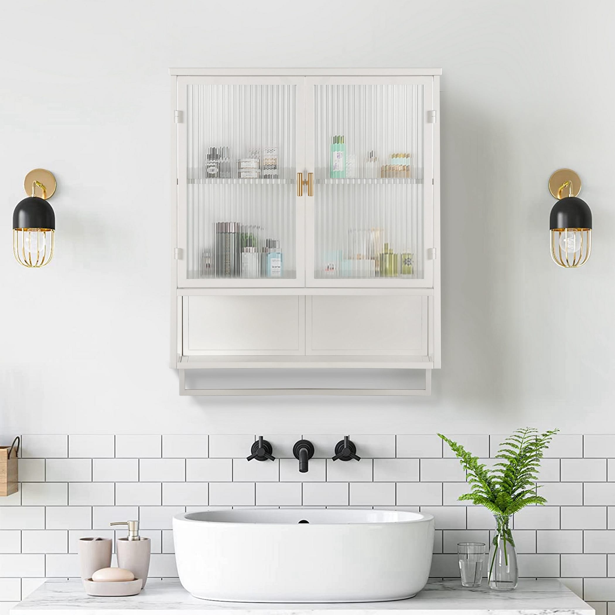 23.62"Glass Doors Modern Two-door Wall Cabinet with Featuring Two-tier Enclosed Storage, an Open Shelf, and Towel Rack