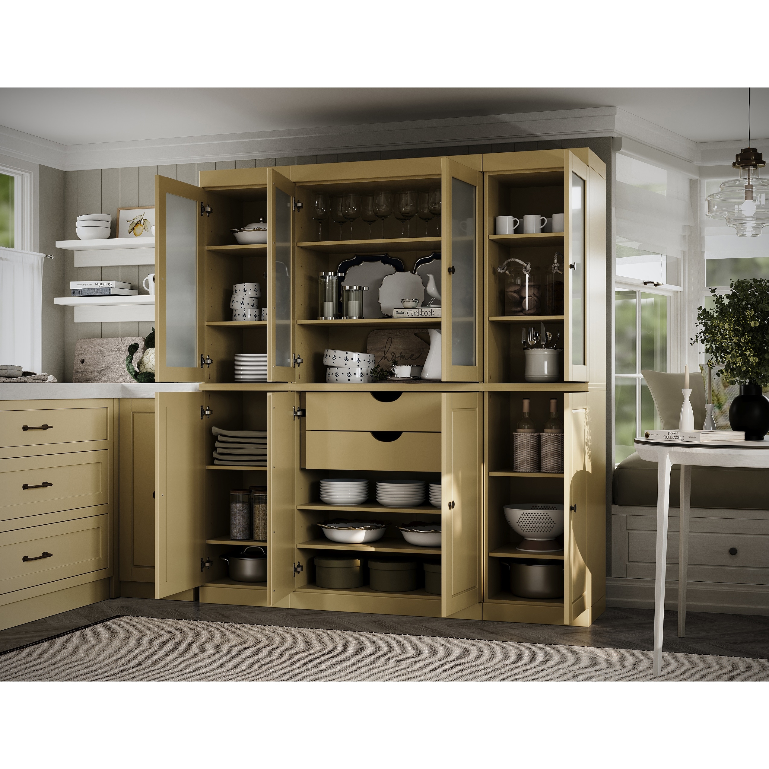 100% Solid Wood 65" Pantry China Cabinet with Frosted Glass Doors and 2-Drawers