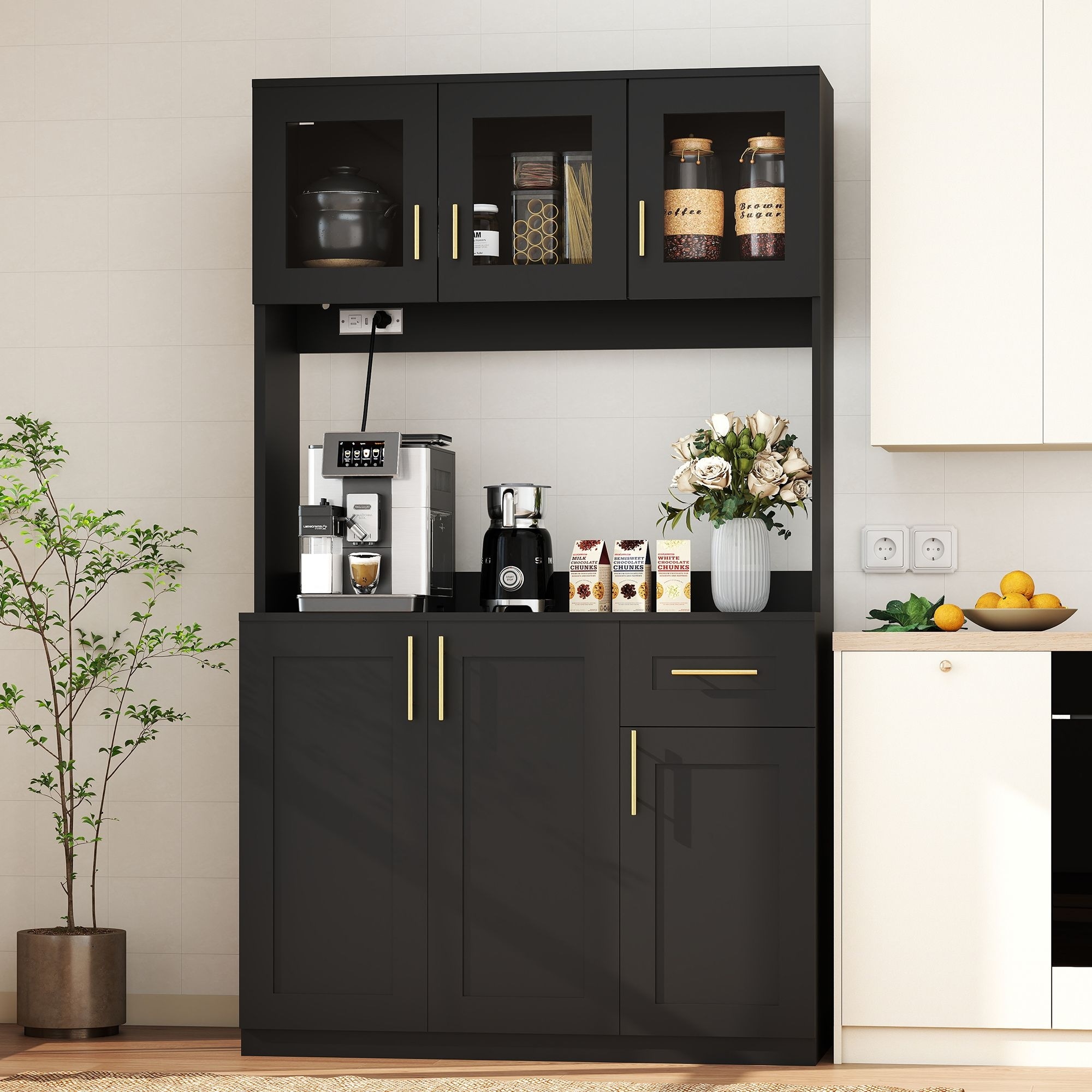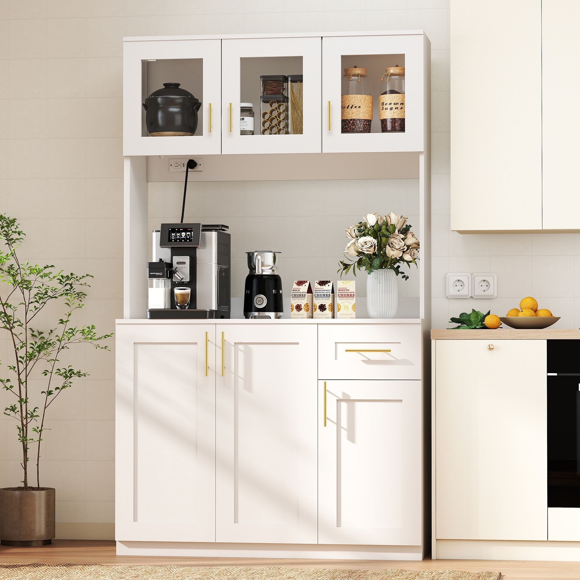 71'' Kitchen Pantry Cabinet with Hutch, Drawer & LED Light, Microwave Stand with Power Outlet for Dining Room or Kitchen