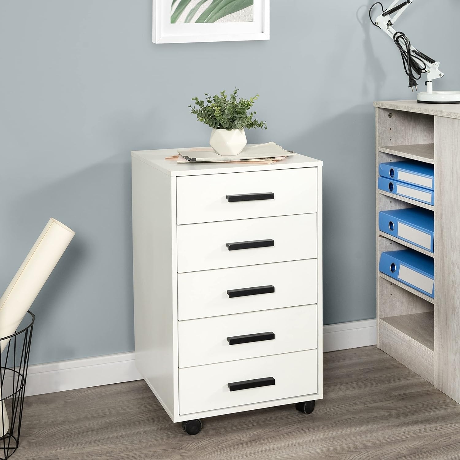 5-Drawer Rolling Under Desk Storage Cart with Lockable Casters, White Engineered Wood, 15.7 x 15.7 x 26 Inches