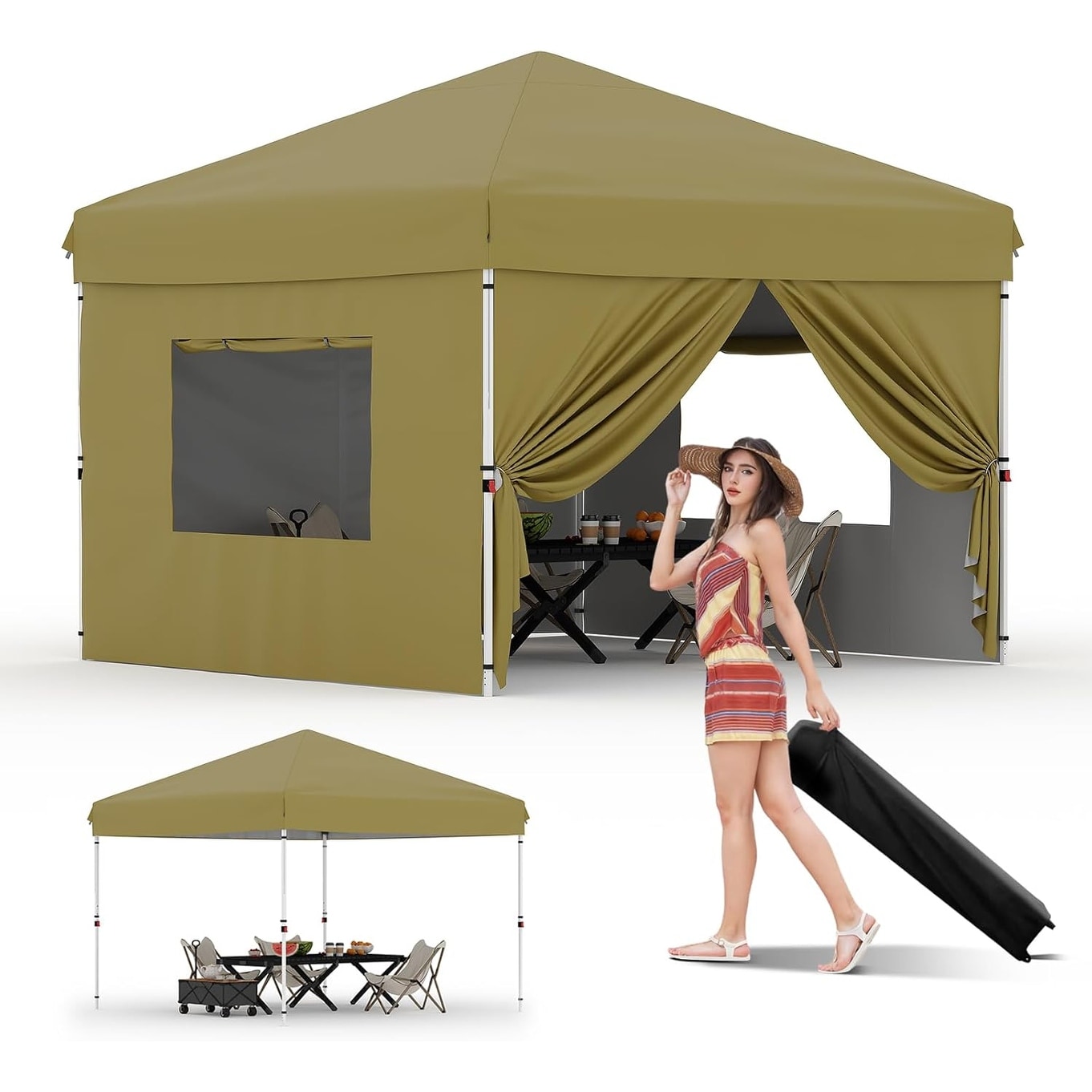10x10FT Pop-Up Canopy with 4 Removable Sidewalls, Khaki