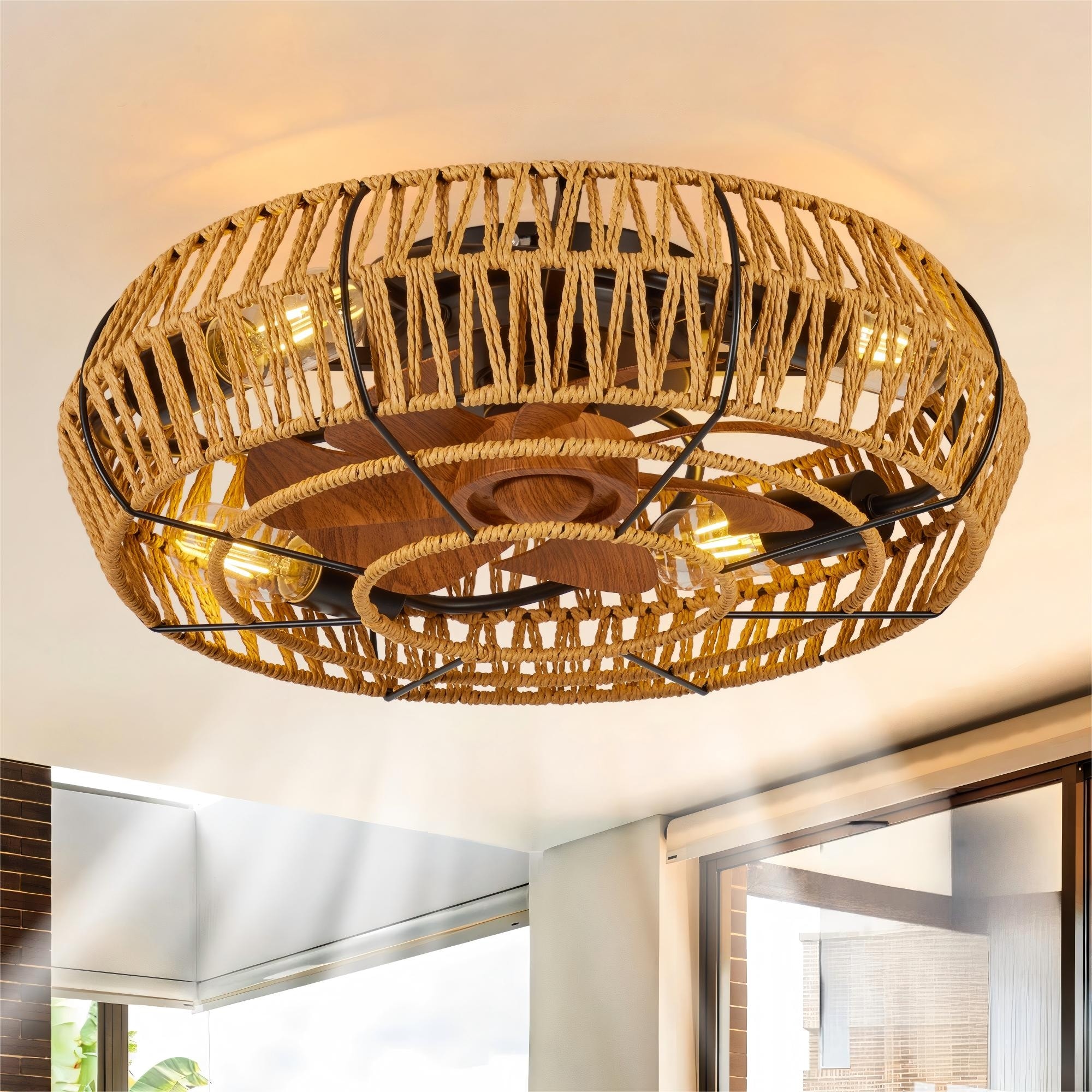 LunaDrift 19"Boho Hand-Woven Rope Caged Ceiling Fan with Lights,6-Speed Low Profile Reversible Flush Mount Fandelier with Remote