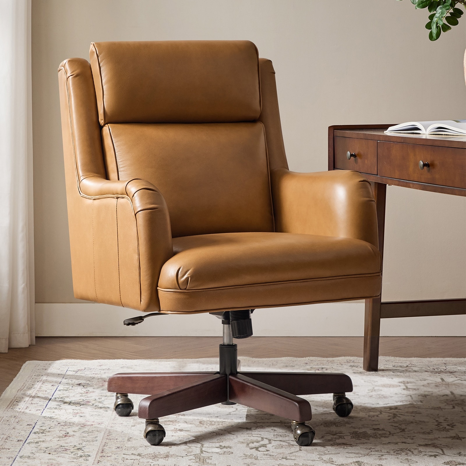 Gaspar Traditional Genuine Leather Swivel Adjustable Height Office Chair with Headrest Adjustment By HULALA HOME