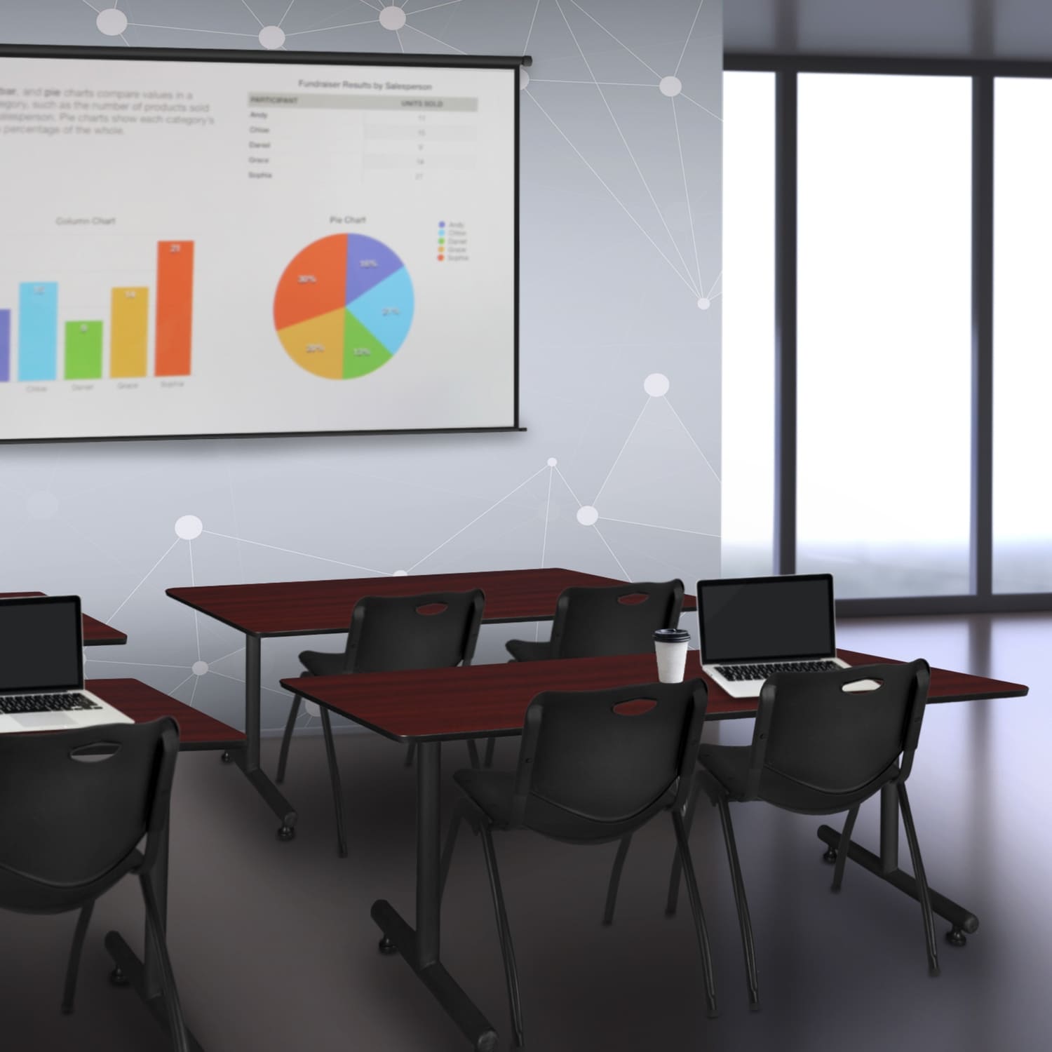 72" x 30" Training Table- Mahogany and 2 "M" Stack Chairs- Black