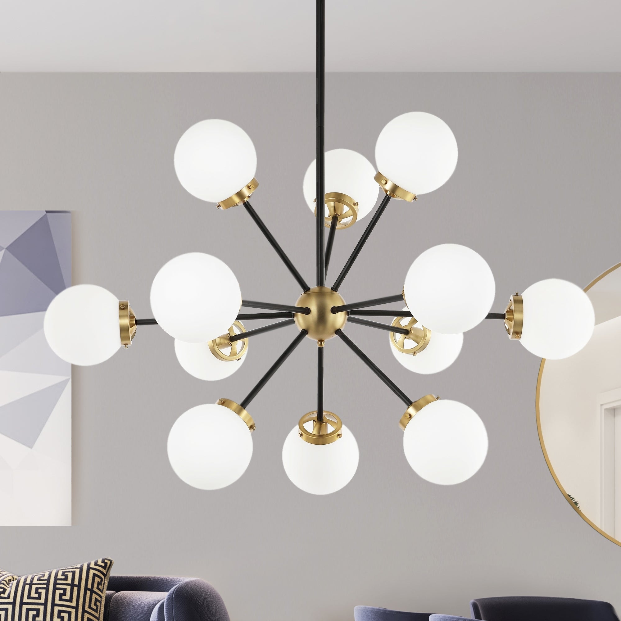 Modern Chandelier Sputnik Black Brass 12-Light Opal Glass