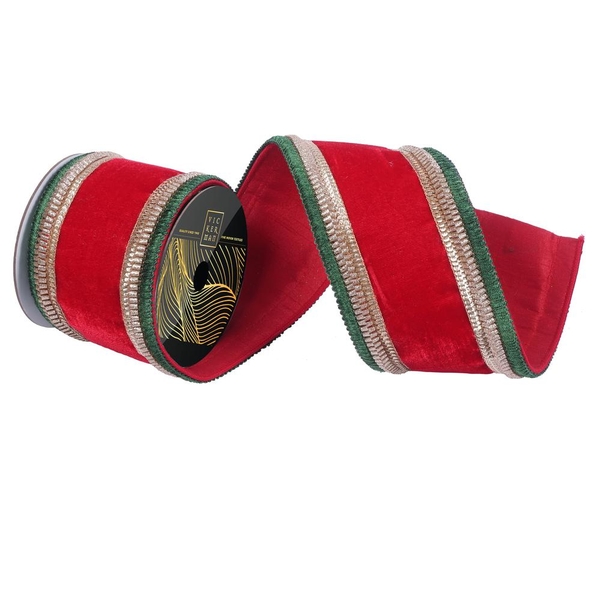 Vickerman 799826 - 4"x5yd Red Velvet Gold/Green Lined Trim (QK256203) Red Colored Christmas Ribbons