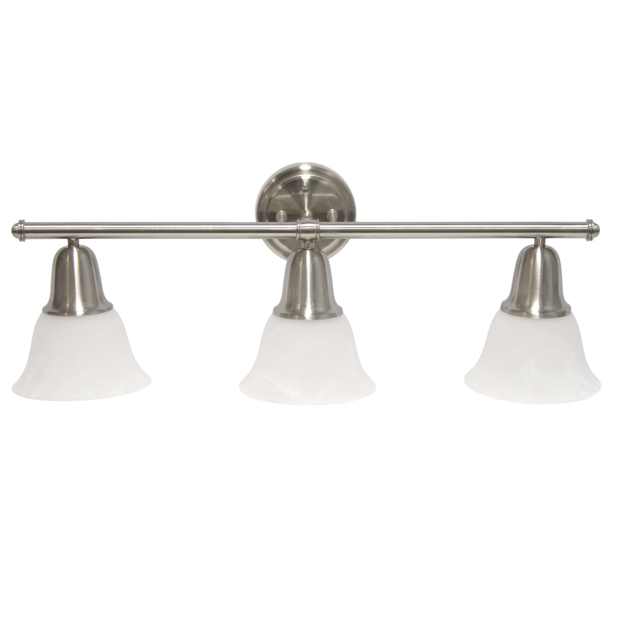 Brushed Nickel Wall Mounted Three Light Vanity Fixture with Alabaster Glass Bell Shade - 26.5" - Silver and White