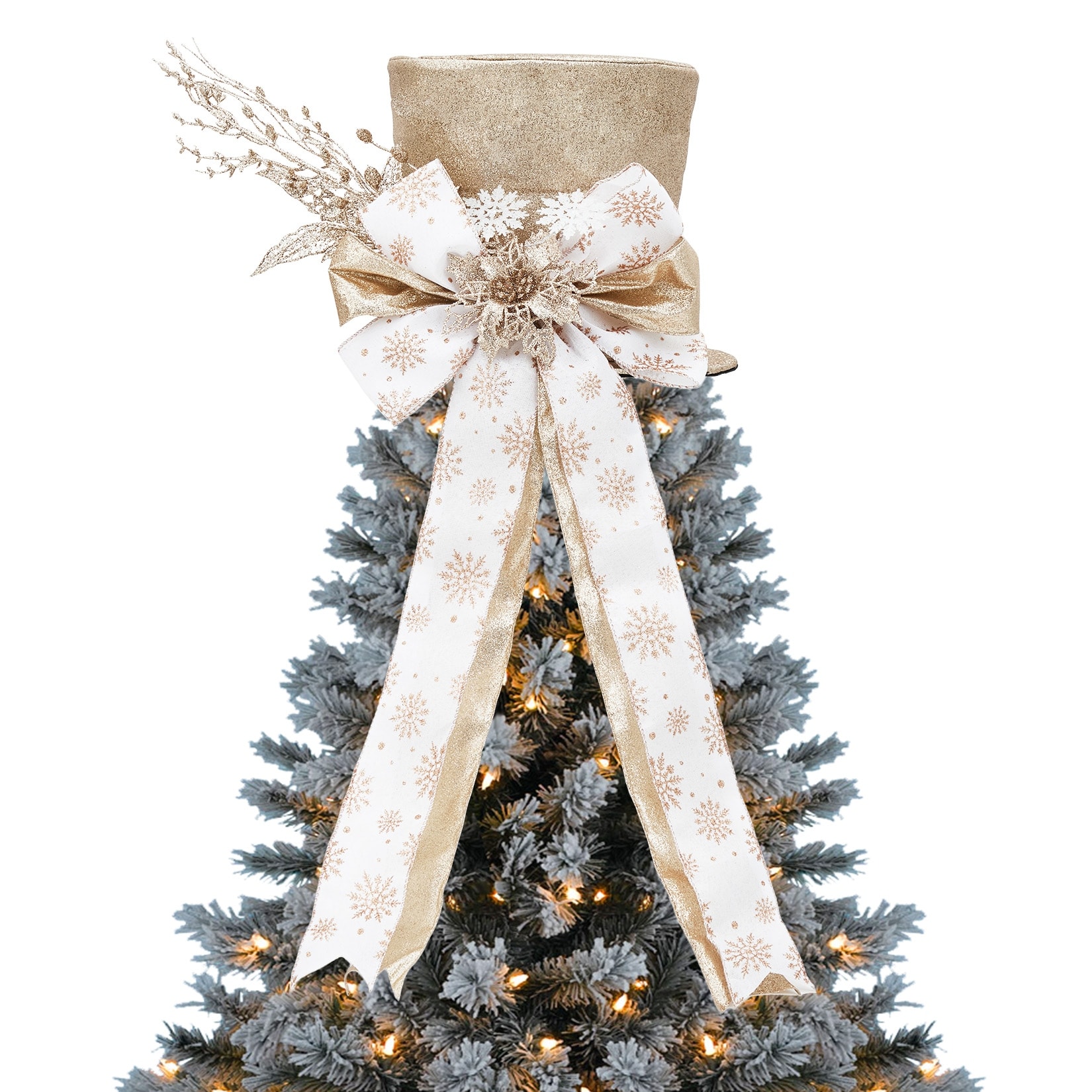 Sparkling Beige Gold Santa Hat Tree Topper with Bow & Snowflakes - 25cm Festive Decor for Xmas Tree & Holiday Display