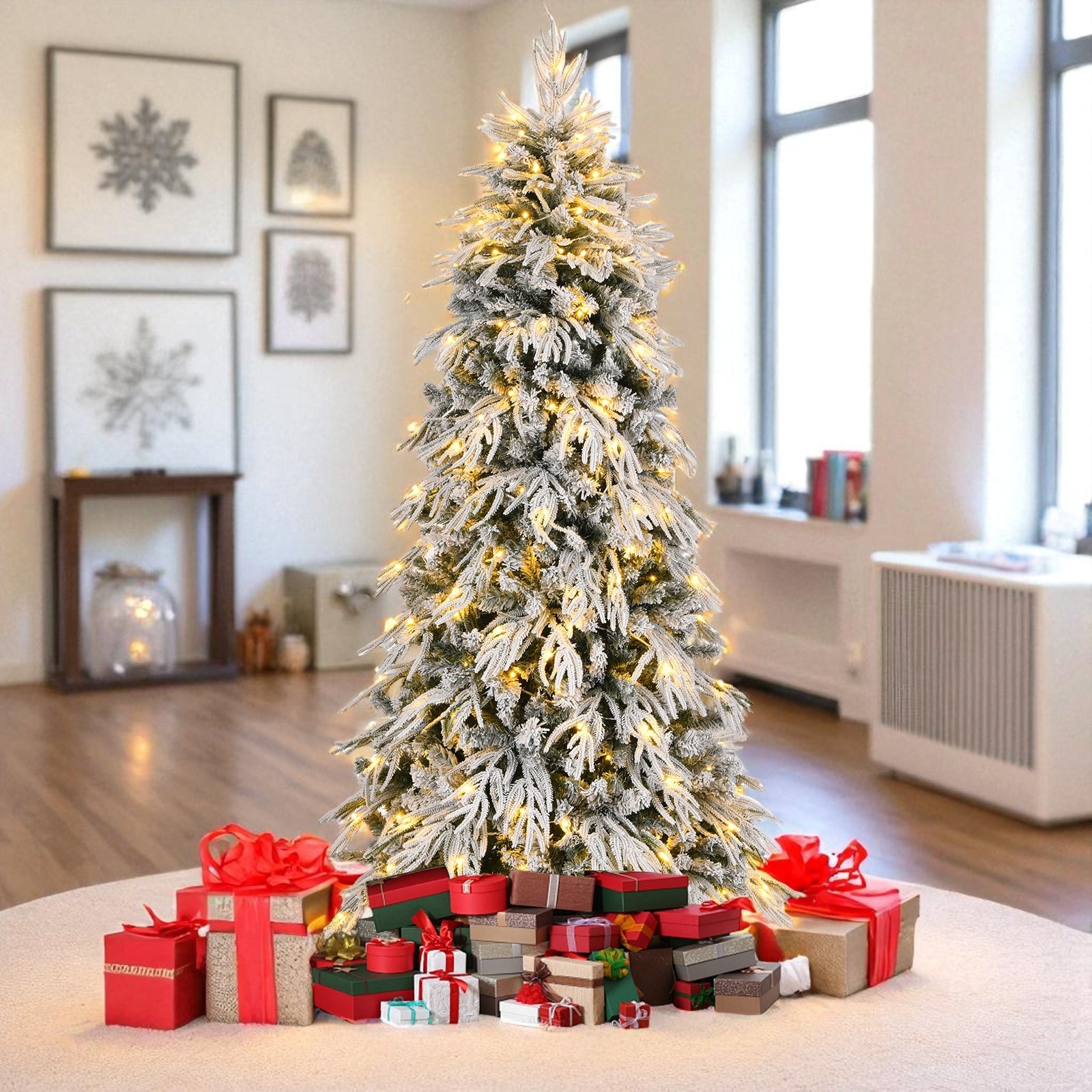 7ft/8ft Slim Flocked Pre-Lit Christmas Tree with 767/950 Tips and 250/350 Warm LED Lights, Metal Stand