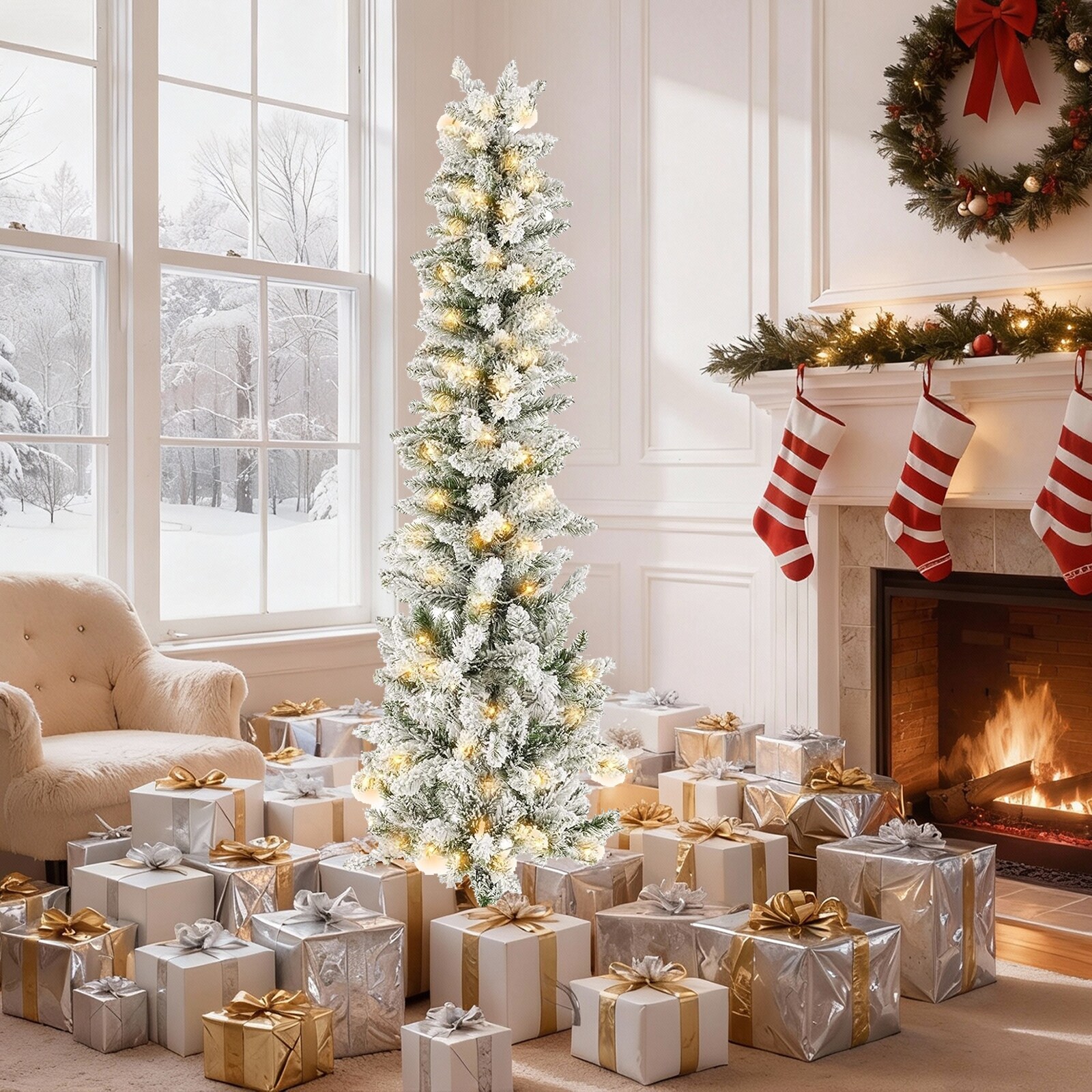 4.5ft Snow Flocked Pencil Christmas Tree w/120 Incandescent Lights, 268 Branch Tips & Foldable Base