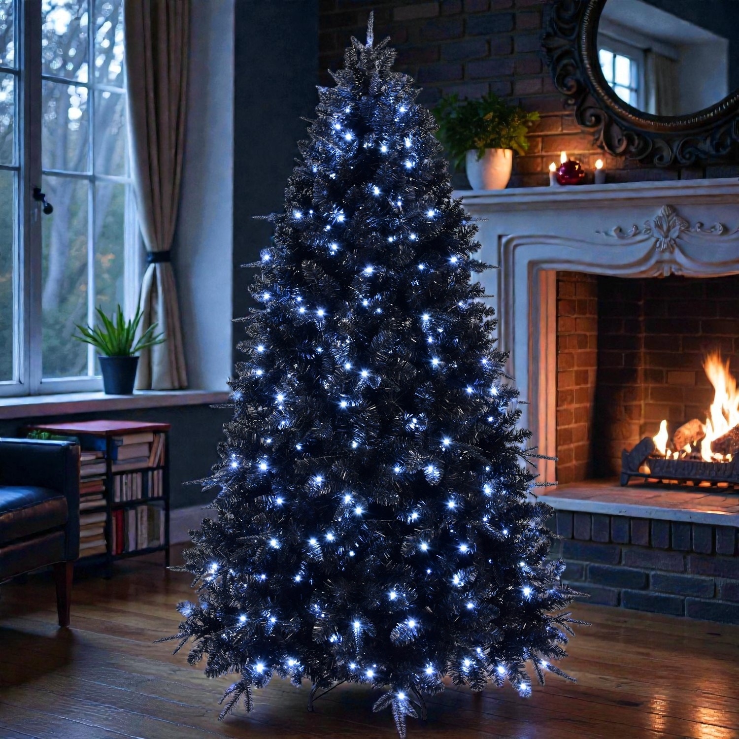 Pre-Lit Artificial Christmas Tree with White LED Lights, PE PVC Tips and Hinged Branches, 5FT 6FT 7FT 7.5FT 8FT or 9FT - Black