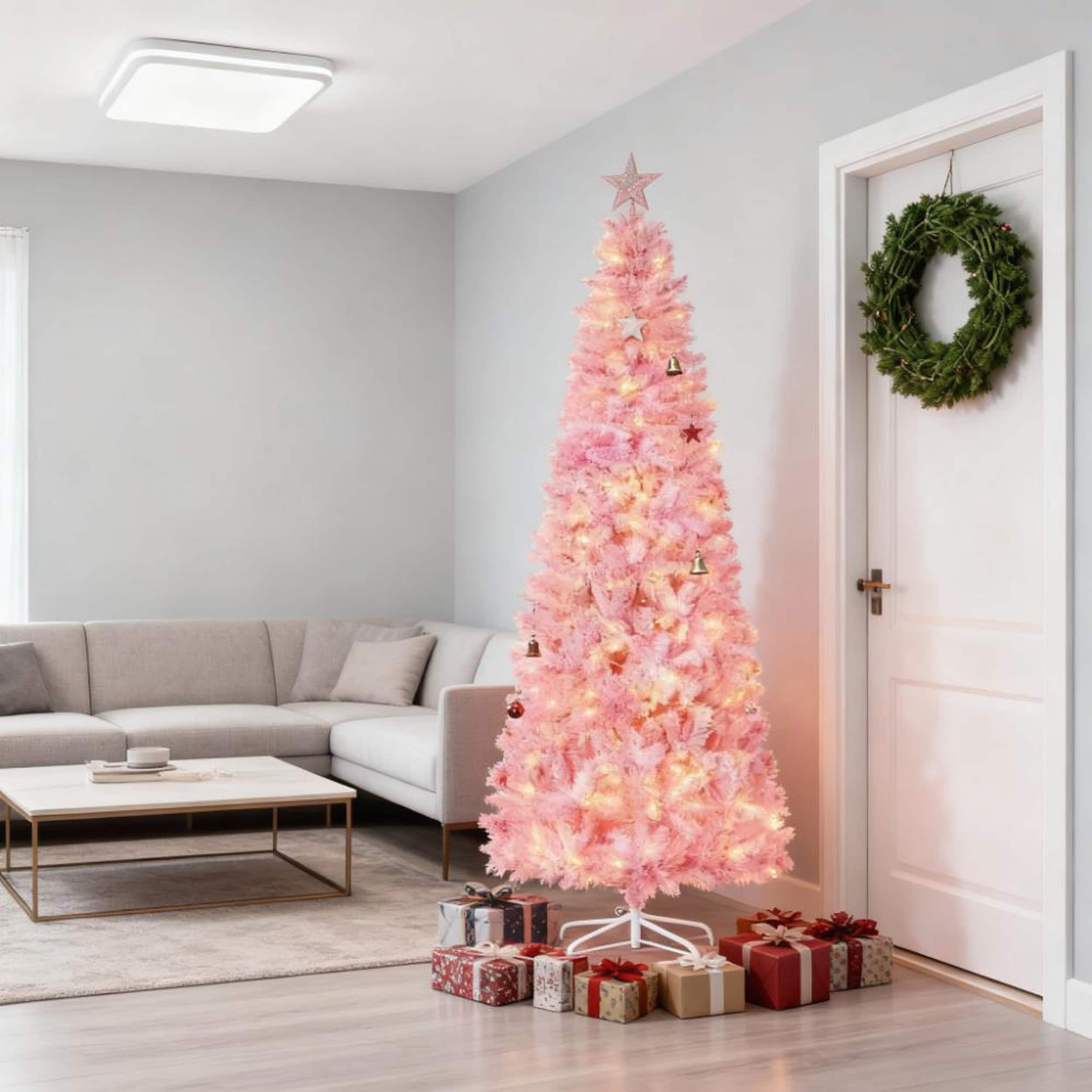 6ft Pencil-Shaped Artificial Christmas Tree with Multi-Mode LED Lights and Space-Saving Design for Indoor Holiday Decor.